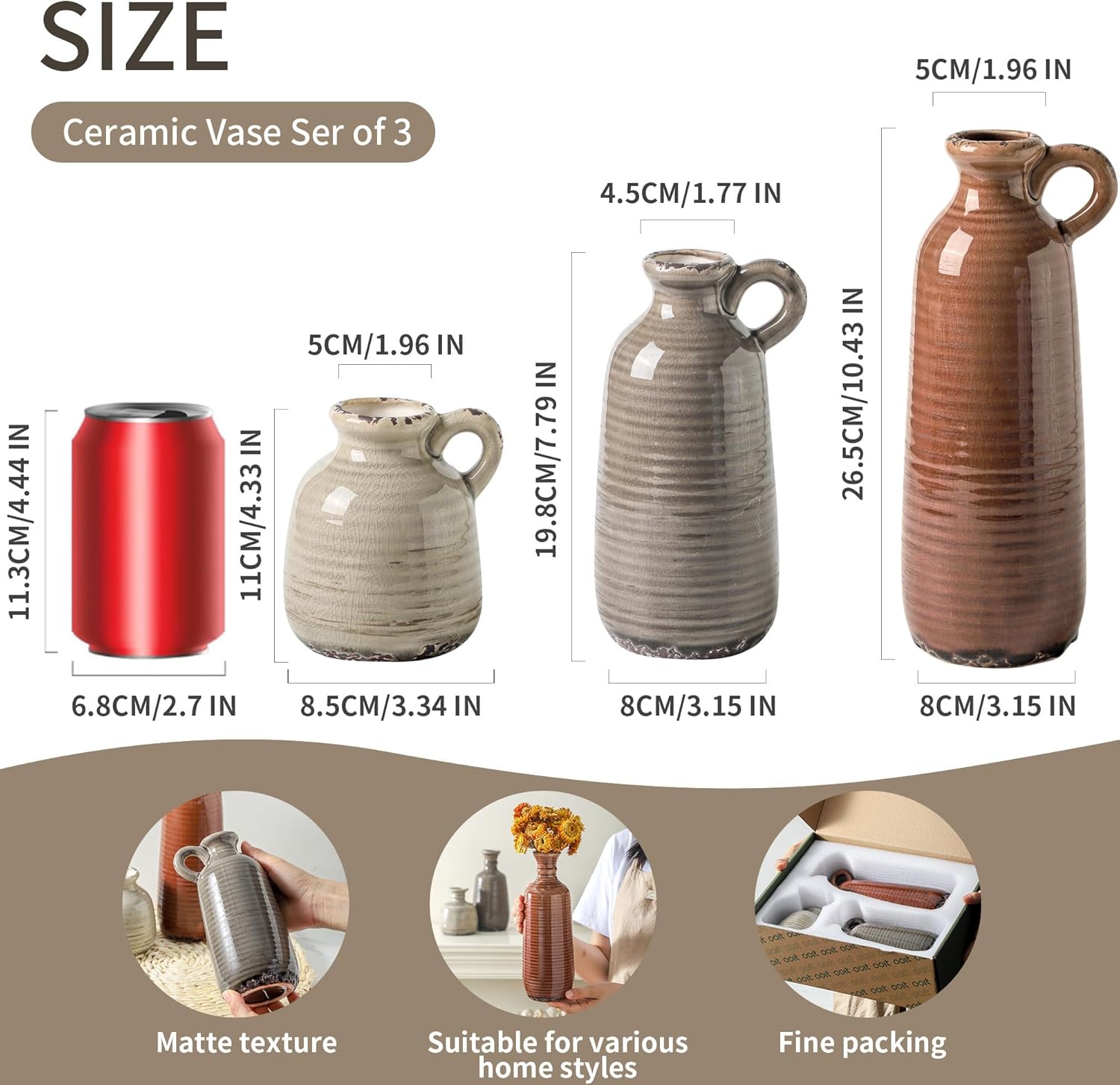 - 【For Multiple Home Décor Styles】Designed in a variety of shapes and sizes, this rustic vases set is a perfect home décor even without flowers. Whether your style is bohemian, modern farmhouse, rustic, or homey, they all fit in perfectly show off your lifestyle and decorative sense of style. (Length X Diameter=10.43X3.15", 7.79X3.15",4.33X3.34").