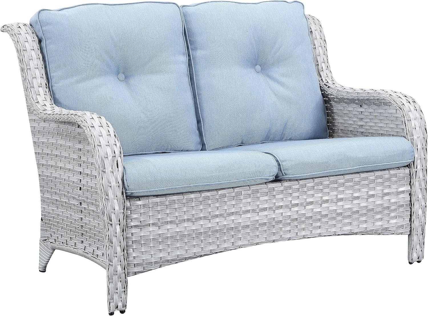 Outdoor Loveseat Small Patio Furniture 2 Seater Wicker Sofa Couch Rattan Seating for Deck Porch Backyard Baby Blue Cushion