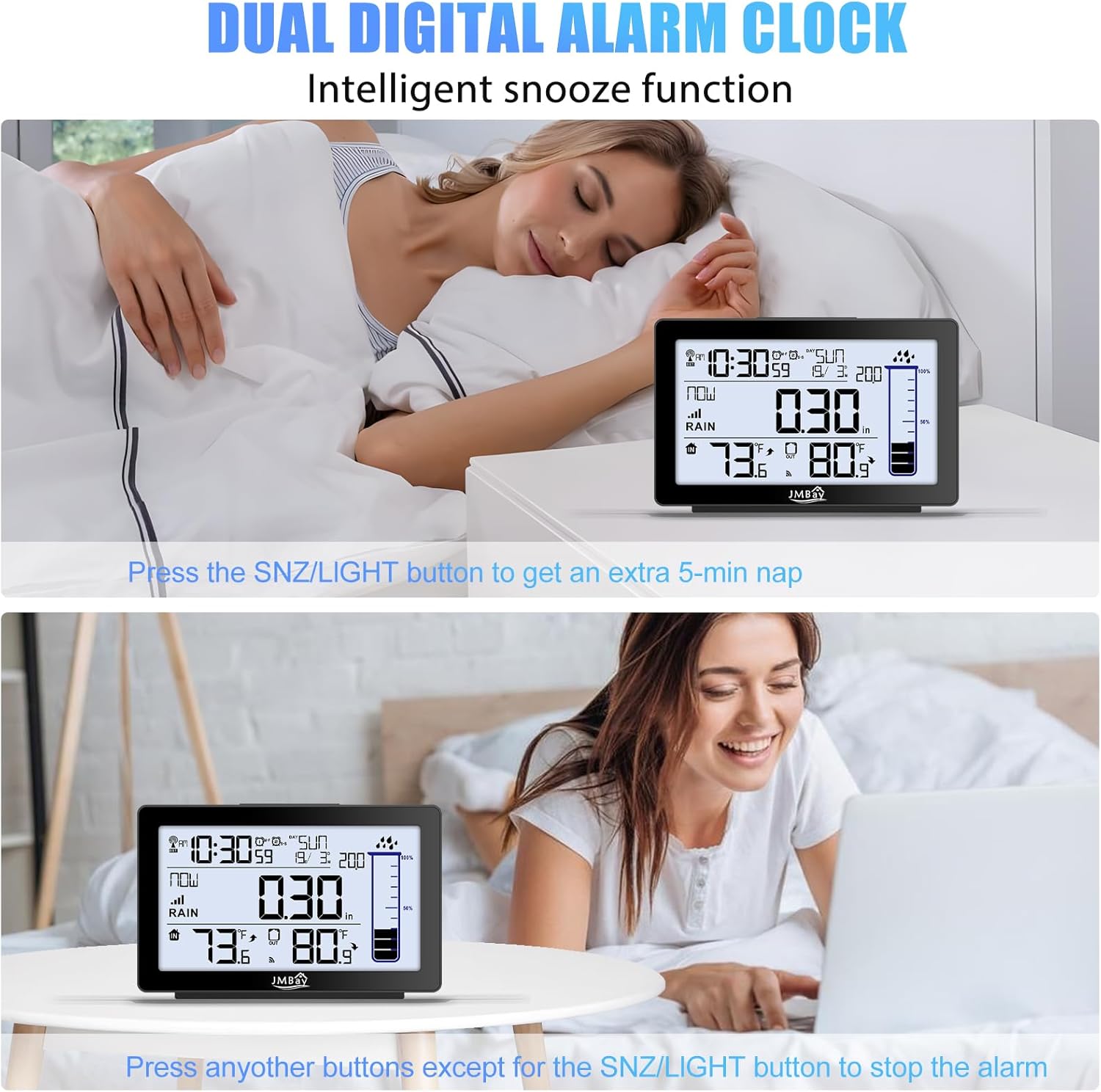 - Multi Function Rain Gauge Weather Station --- In addition to rainfall monitoring, this digital rain gauge can also provide real-time indoor and outdoor temperatures, WWVB Radio control time function. Whatβs more, dual alarm clock with snooze function and calendar is practical in your usual life. Functional and stylish, JMBay rain gauge weather station is the perfect decoration for your living room, bedroom, office, greenhouse, tent, and more.