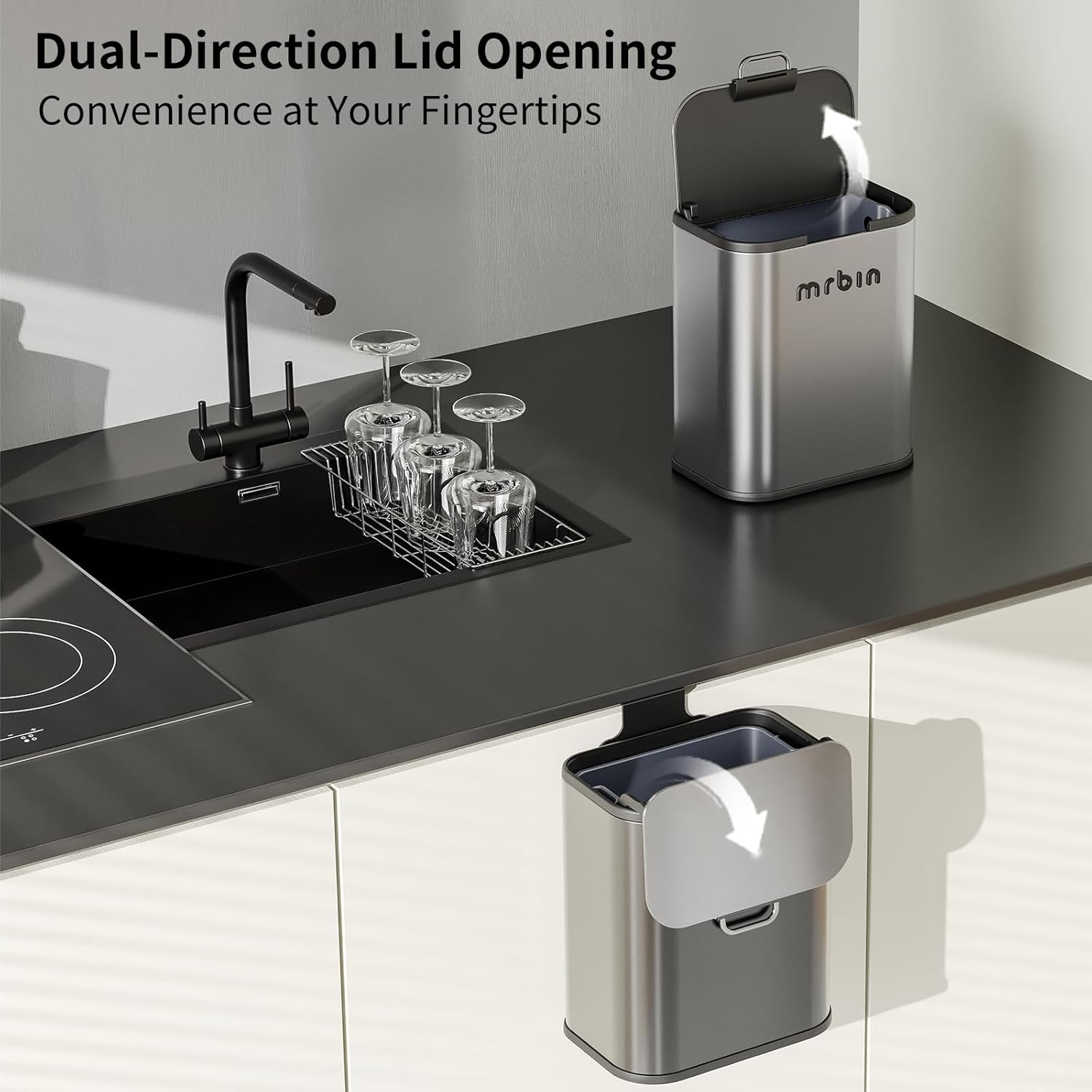 MRBIN Kitchen Stainless Steel Compost Bin with Lid Countertop, 6l / 1.6gal Small Indoor Hanging Trash Can for Cabinet Door, Small Under Sink Food Scraps Garbage Pail, Eclipse-Grey