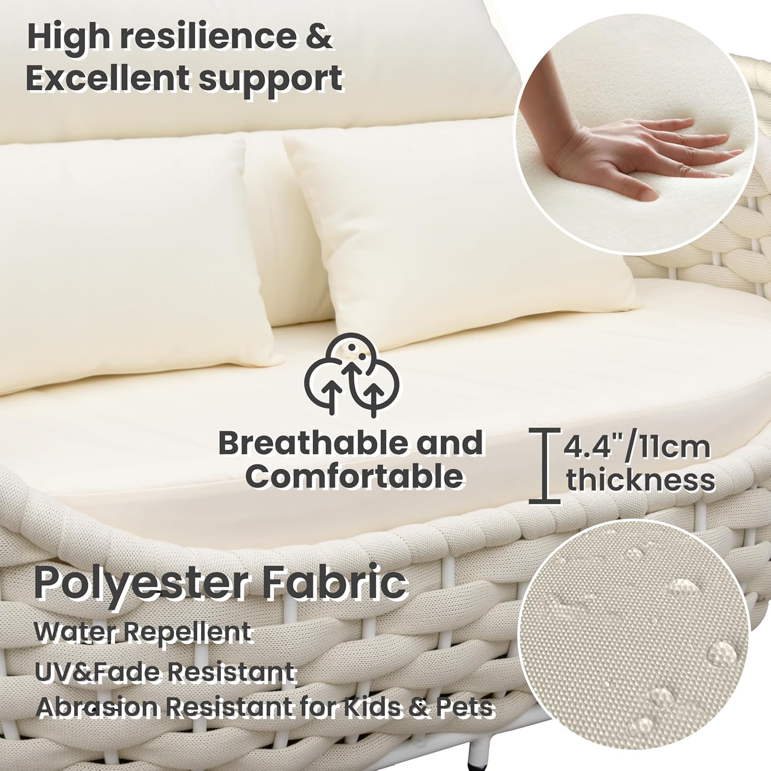 - Filled with 4.3"/11cm thick high-density foam and cotton, cushions are soft touching and breathable for a refresh comfy outdoor seating holding its shape in long time using. Water repellent and abrasion resistant polyester fabric also fits families with kids and pets