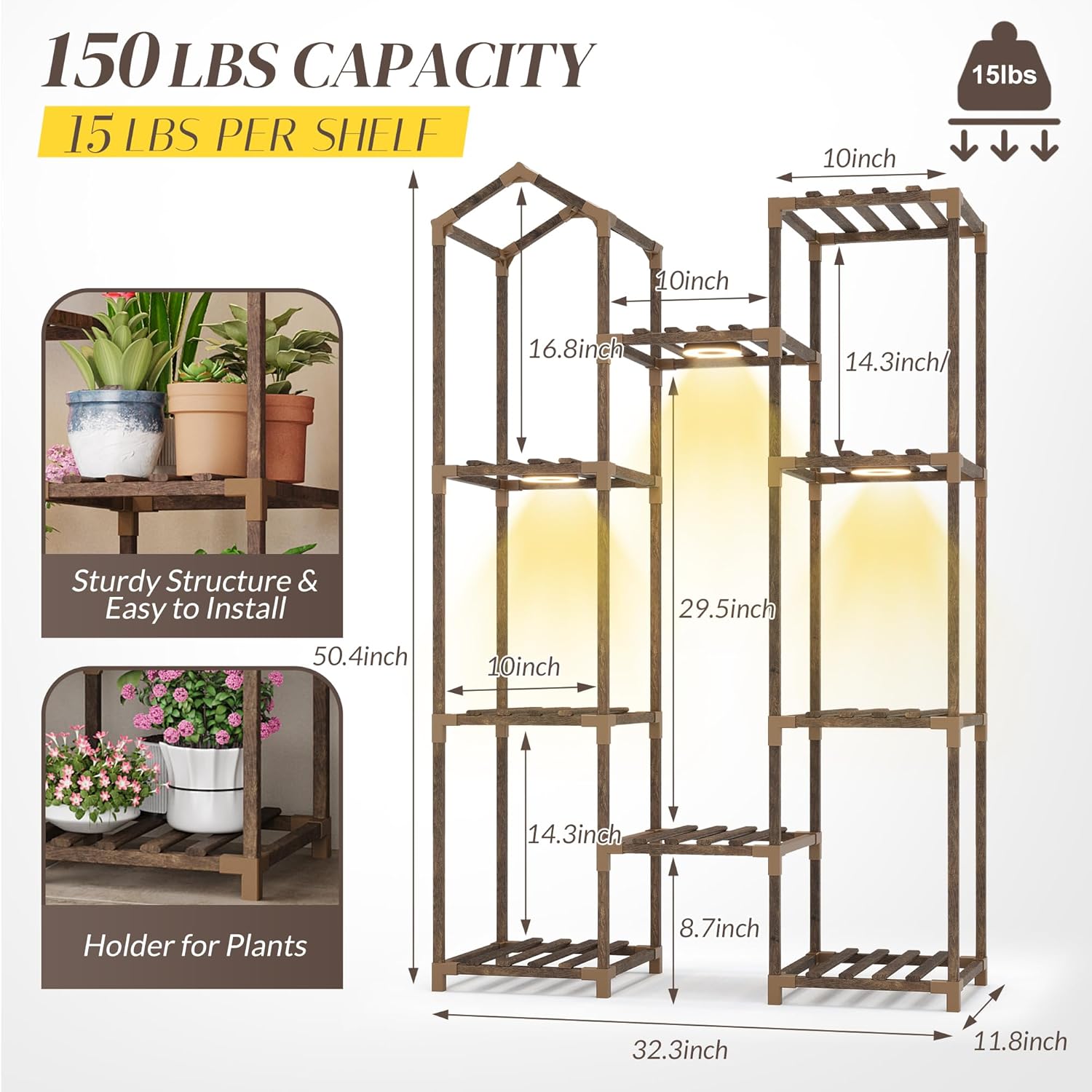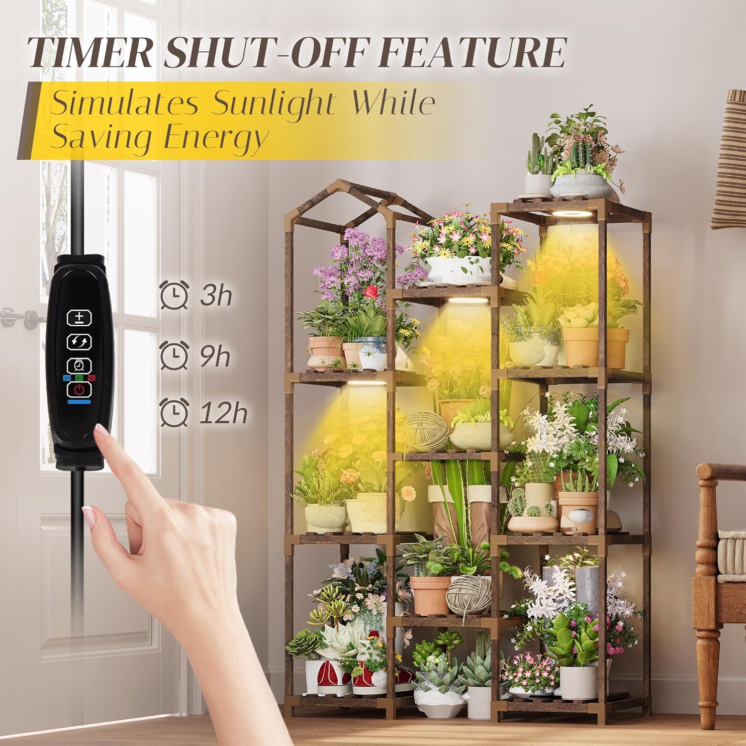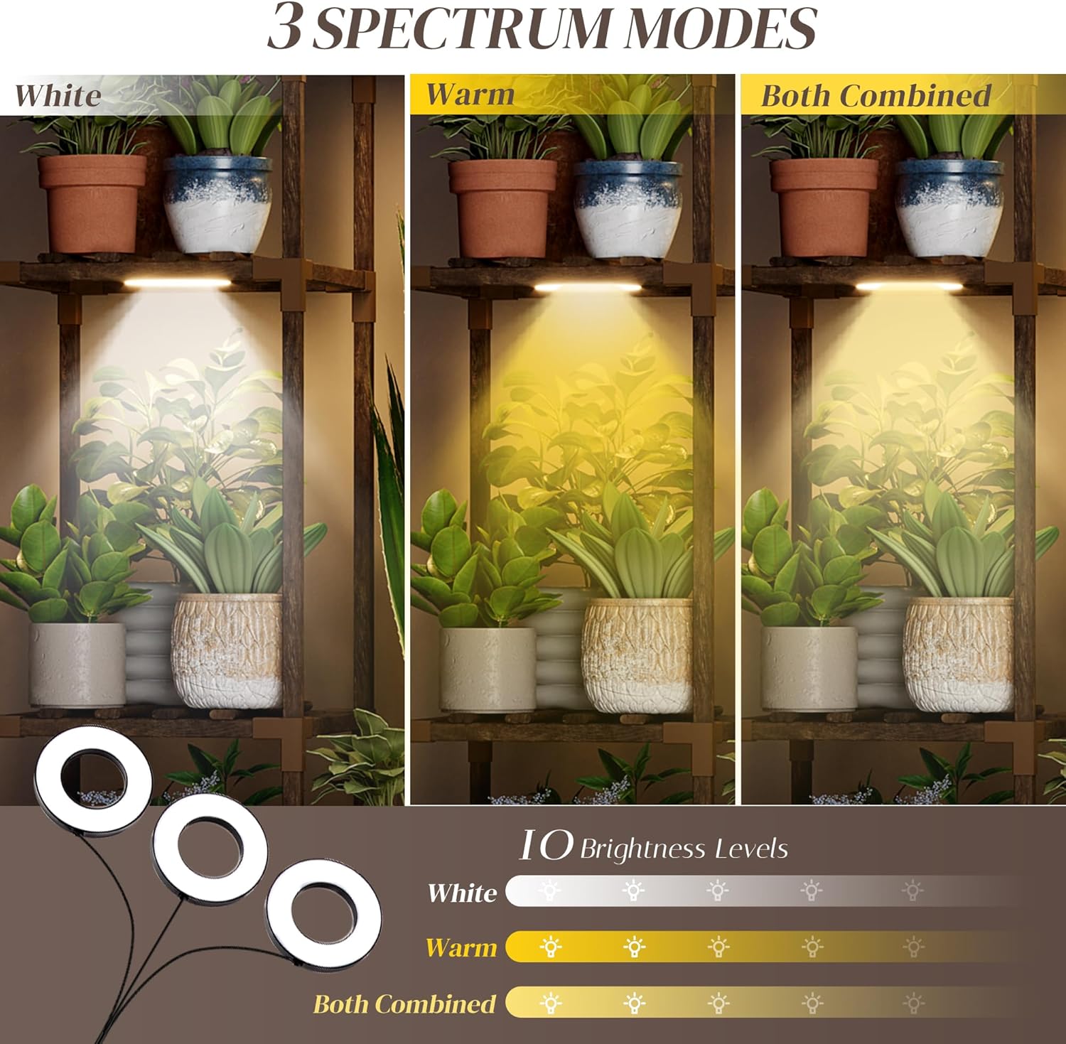 - Plant Stand with Three-Mode Full-Spectrum Light System: This indoor plant shelf comes with adjustable grow lights to support plant growth at every stage. The three-head light system offers warm white, cool white, and a combined dual-light mode, ensuring your plants receive the ideal lighting environment. It eliminates the need to move plants outside for sunlight. Energy-efficient LEDs provide a natural spectrum to enhance plant vitality and create a cozy ambiance in your space