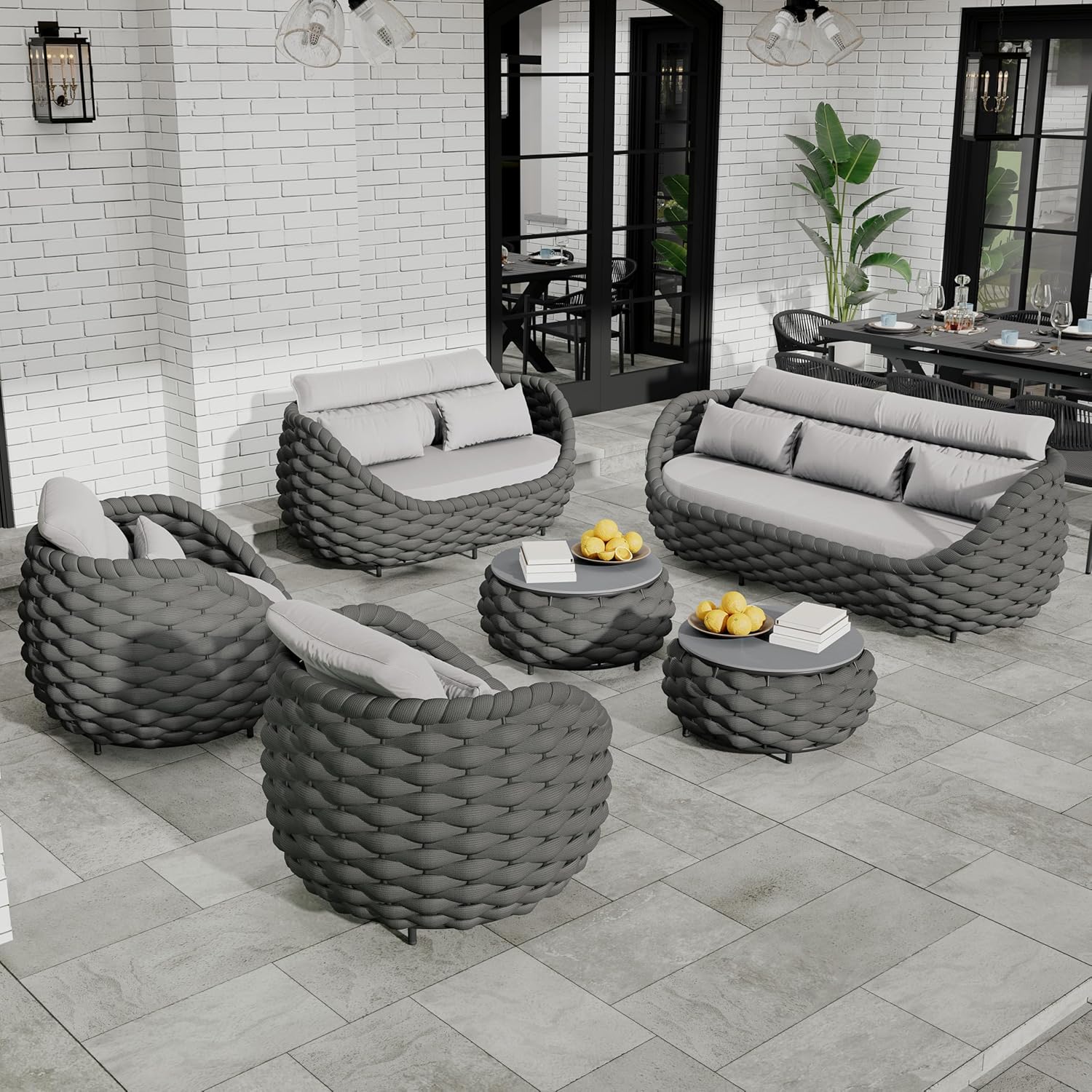 - Furniture set is crafted from reinforced rust-free aluminum alloy frame, wrapped in hand woven polyester rope. The 6 pieces all weather patio upholstered conversation set resists to UV, rain, wind, salt water. Perfect for indoor outdoor even arid or coastal areas