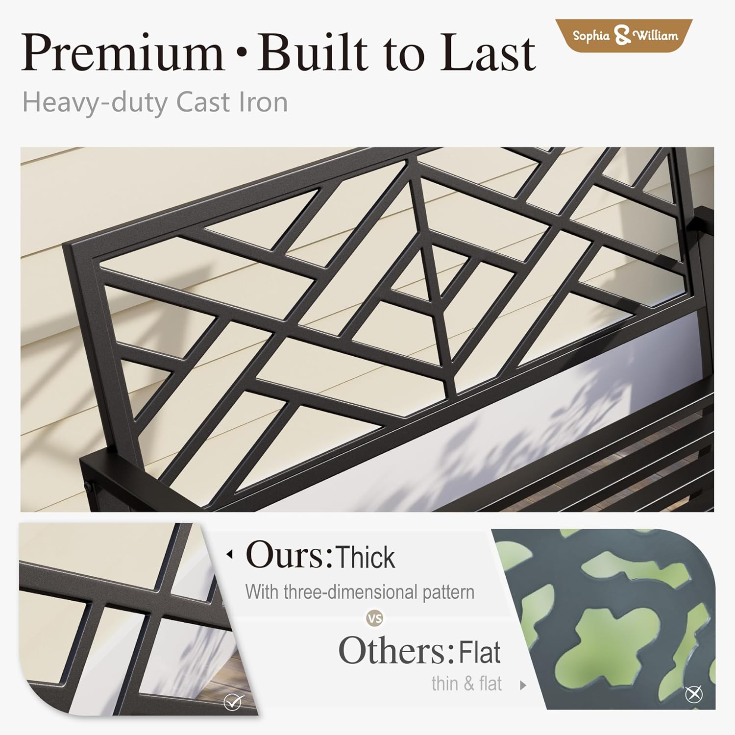 - Superior Material: The outdoor bench is made of Cast Iron to ensure sturdiness and stability, making it heavy-duty oriented and durable enough for long-term use. The surface comes with special e-coating for rust resistance and weather resistance, all edges are finished, super smooth and no raw cuts or drips to catch on clothing