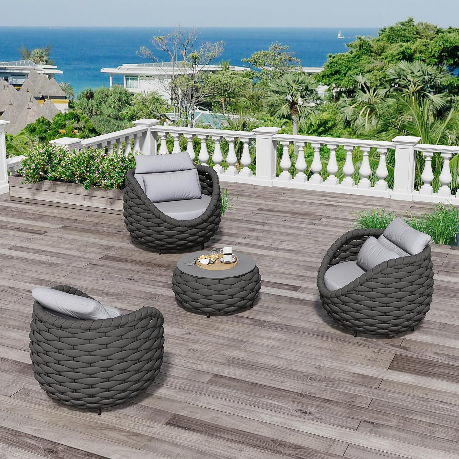 4 Pieces Courtyard Seating Set: Aluminum Woven Rope Patio Furniture Chair Set - All Weather Metal Outdoor Conversation Set - Assembled Armchair w/Table for Bistro Deck Porch Balcony Apartment