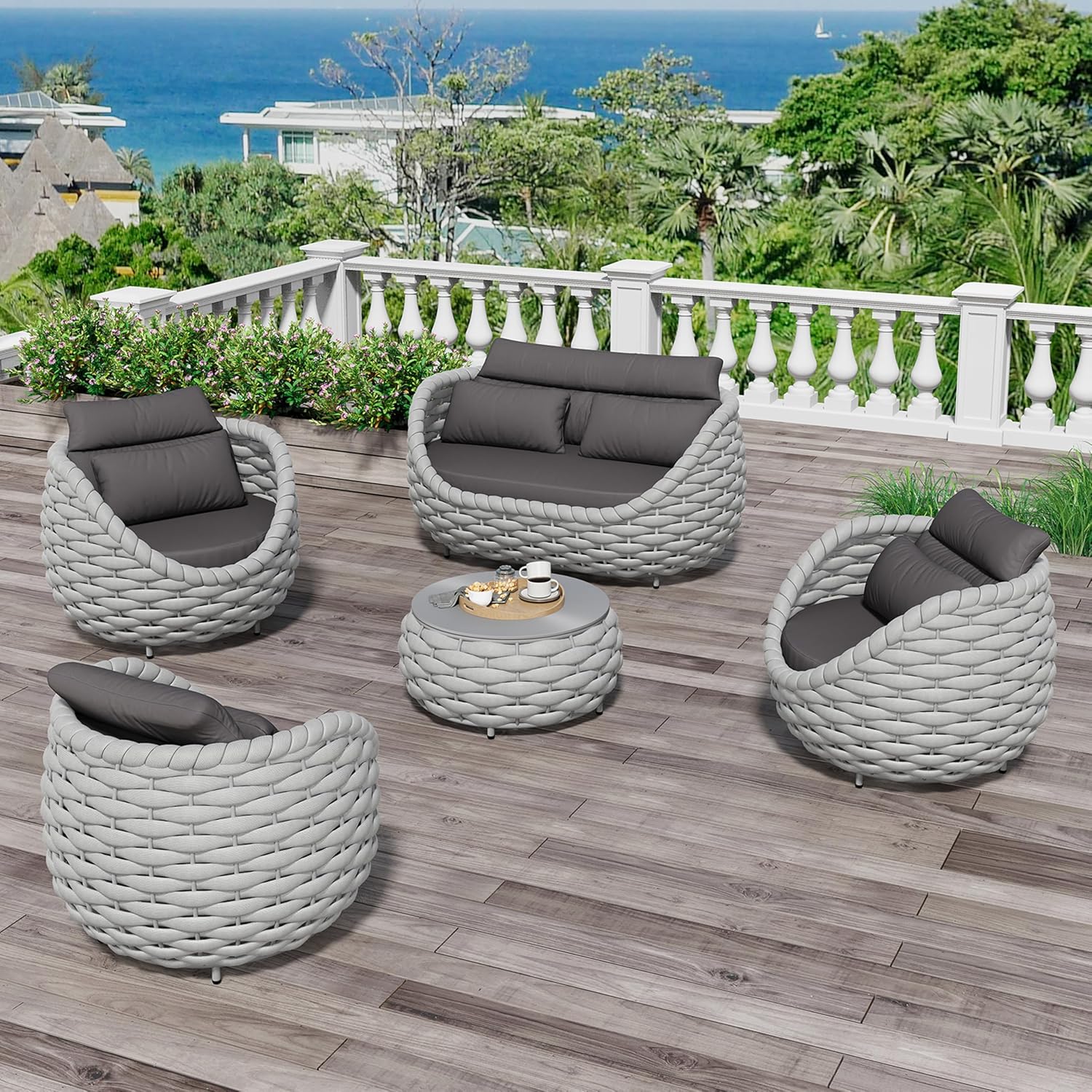 Fully Assembled Patio Furniture Set: 5-Piece Woven Rope Outdoor Conversation Set Cushioned - Modern Metal Deck Loveseat Chair Table Set - Porch Seating for Courtyard Garden Poolside Hotel Resort