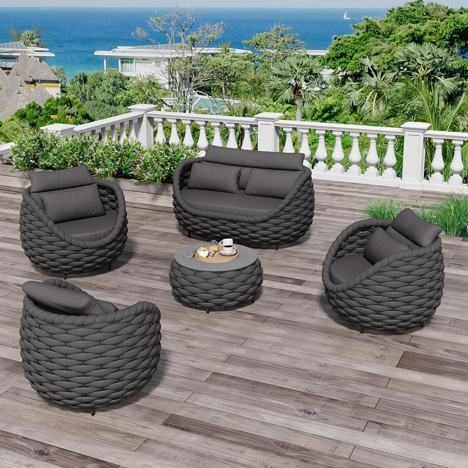 Fully Assembled Patio Furniture Set: 5 Pieces Woven Rope Outdoor Conversation Set Cushioned - Modern Metal Deck Loveseat Chair Table Set - Porch Seating For Yard Garden Poolside Hotel, Dark Grey