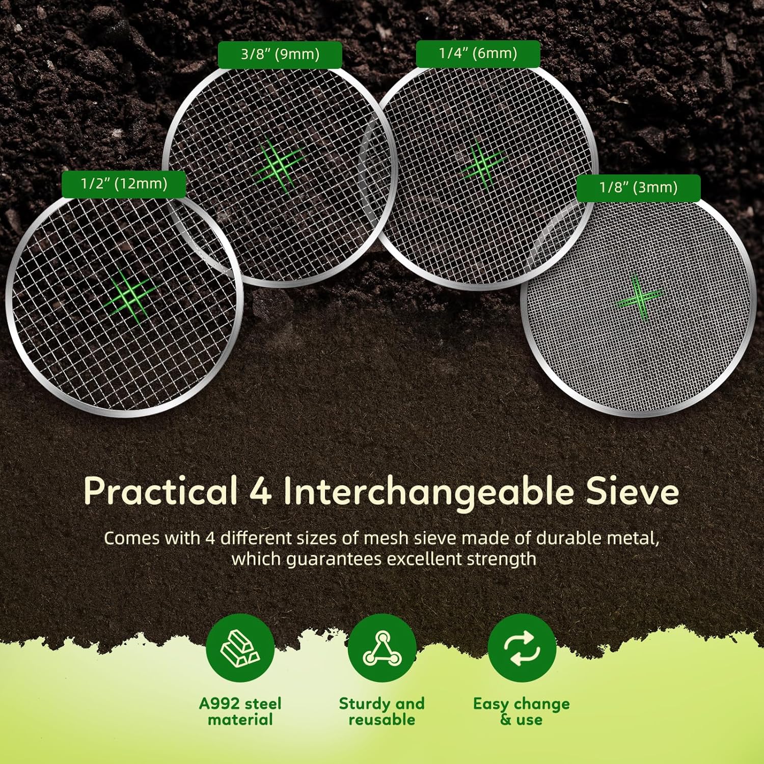 New Upgrade Rotary Soil Sifter Compost Sieve, 13 Inch Heavy-Duty Garden Soil Screen with 4 Replaceable Sifting Sieve (3/6/9/12mm) for Sand Rocks Dirt Compost, Includes Gardening Shovel & Gloves Kit