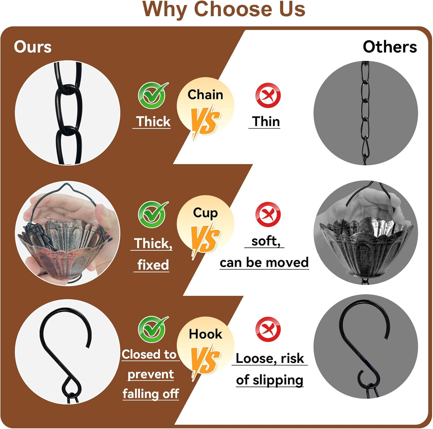 - Improved Stability & Reduced Splashing: Lotus rain chain features a thickened chain, triangular hook, and decorative glass ball for added stability; Each cup has a 0.8" hole and connects with extra links to ensure smooth water flow and reduce splashing