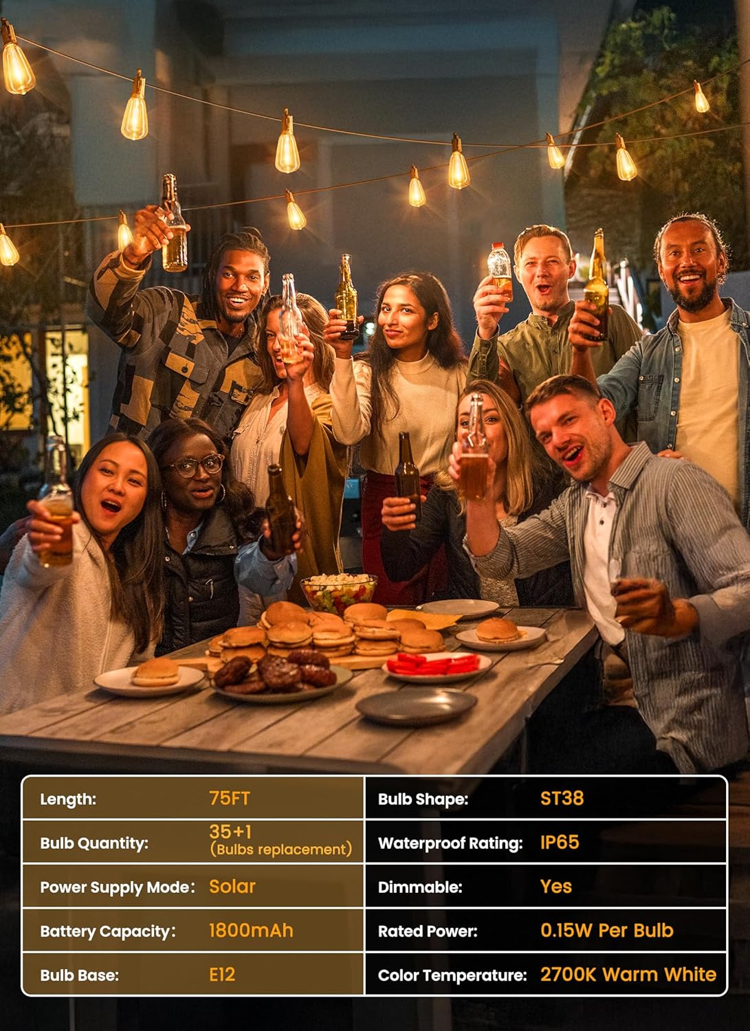 - ăShatterproof & Solar LED String Lightsă75ft long durable string lights with 36 (35+1 spare) LED Lights, solar energy supply, adjustable monocrystalline silicon solar panel with better conversion rate of energy, meet your needs of different scenarios and no need to replace the battery or extra utility electric cost; IP65 waterproof, light sensor controls the solar string lights auto on at dark and auto off at daytime.