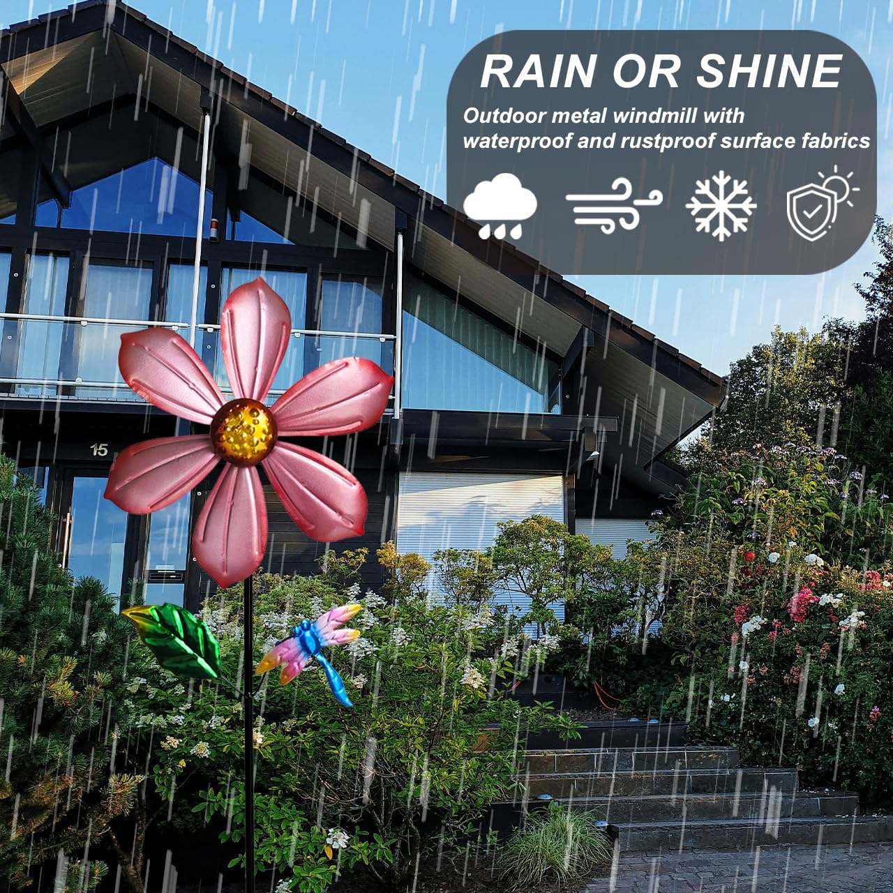 - All-Season Metal Mastery Crafted with premium metal construction and rustproof coating, Senflame's 36-inch wind spinners thrive through rain, snow, and UV exposure. The 8-inch diameter dual-pack design (pink borders + cobalt petals) creates hypnotic motion while maintaining structural integrity—perfect for permanent yard windmill displays or dynamic garden spinners outdoor. Includes corrosion-resistant stakes for effortless installation in soil, grass, or patio cracks.
