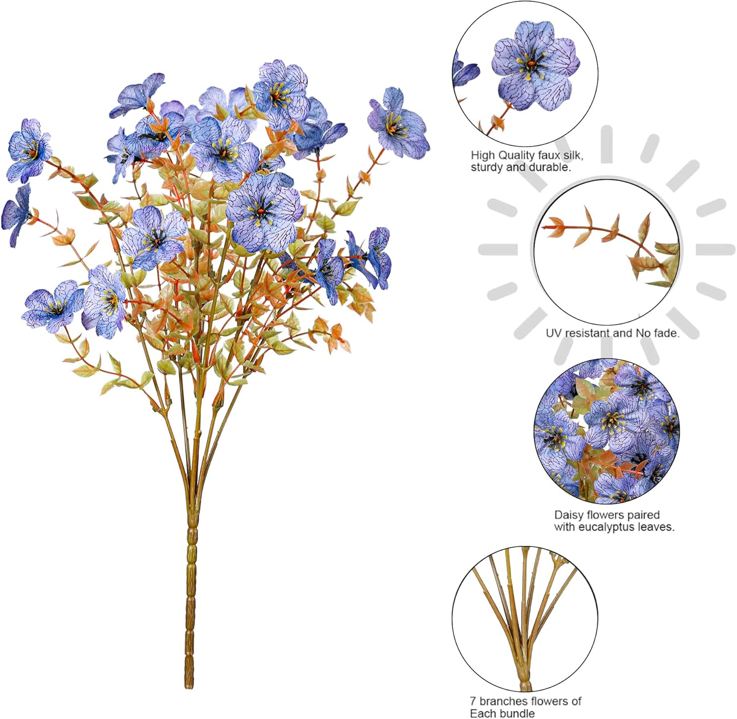 - High Quality: High quality silk material daisy flowers and plastic eucalyptus leaves. UV and all weather resistant. It will blooms all year round.