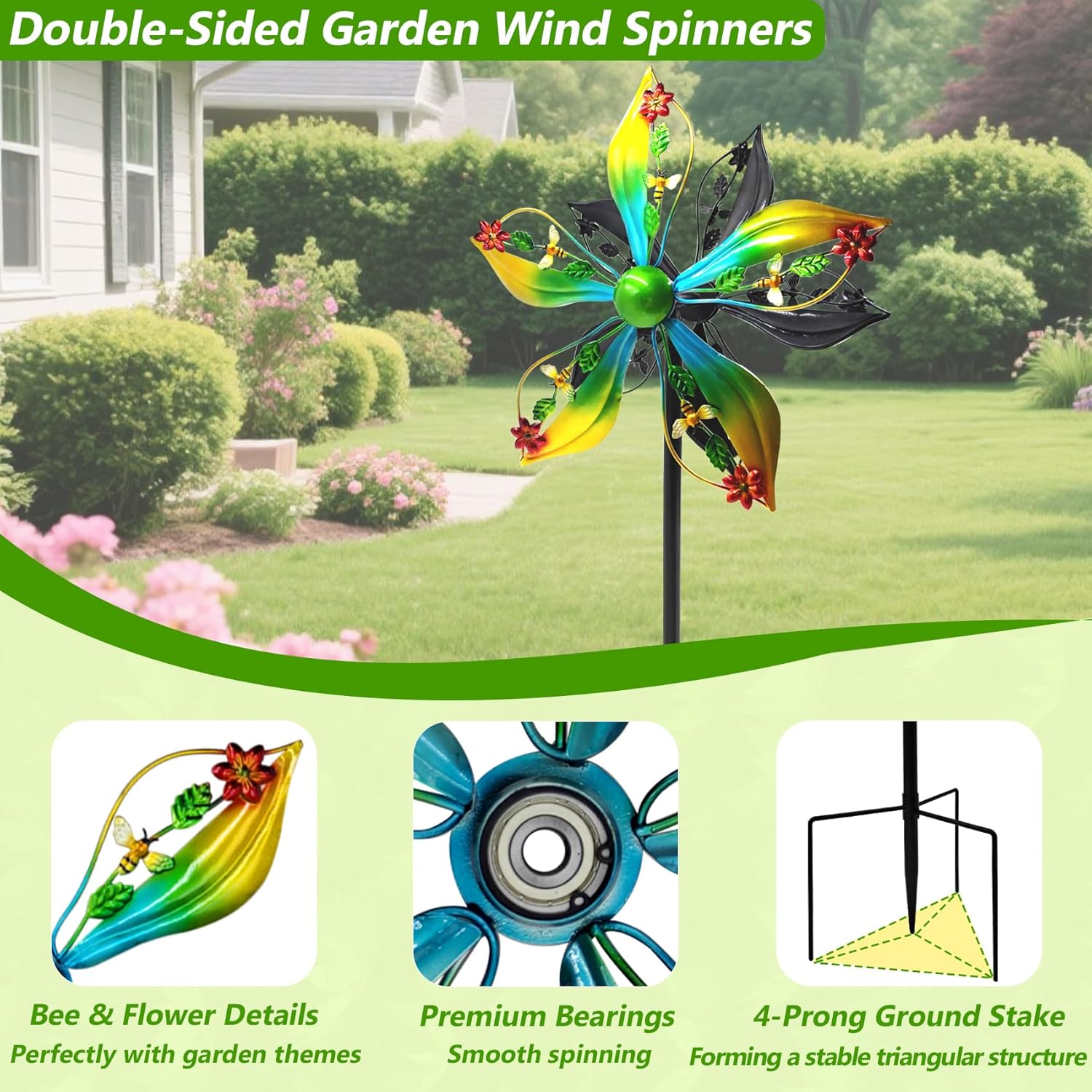 - Double-Sided Kinetic Design: Features two opposing sets of blades that spin smoothly from any direction; The dual-sided design creates captivating motion and adds energy to your yard art