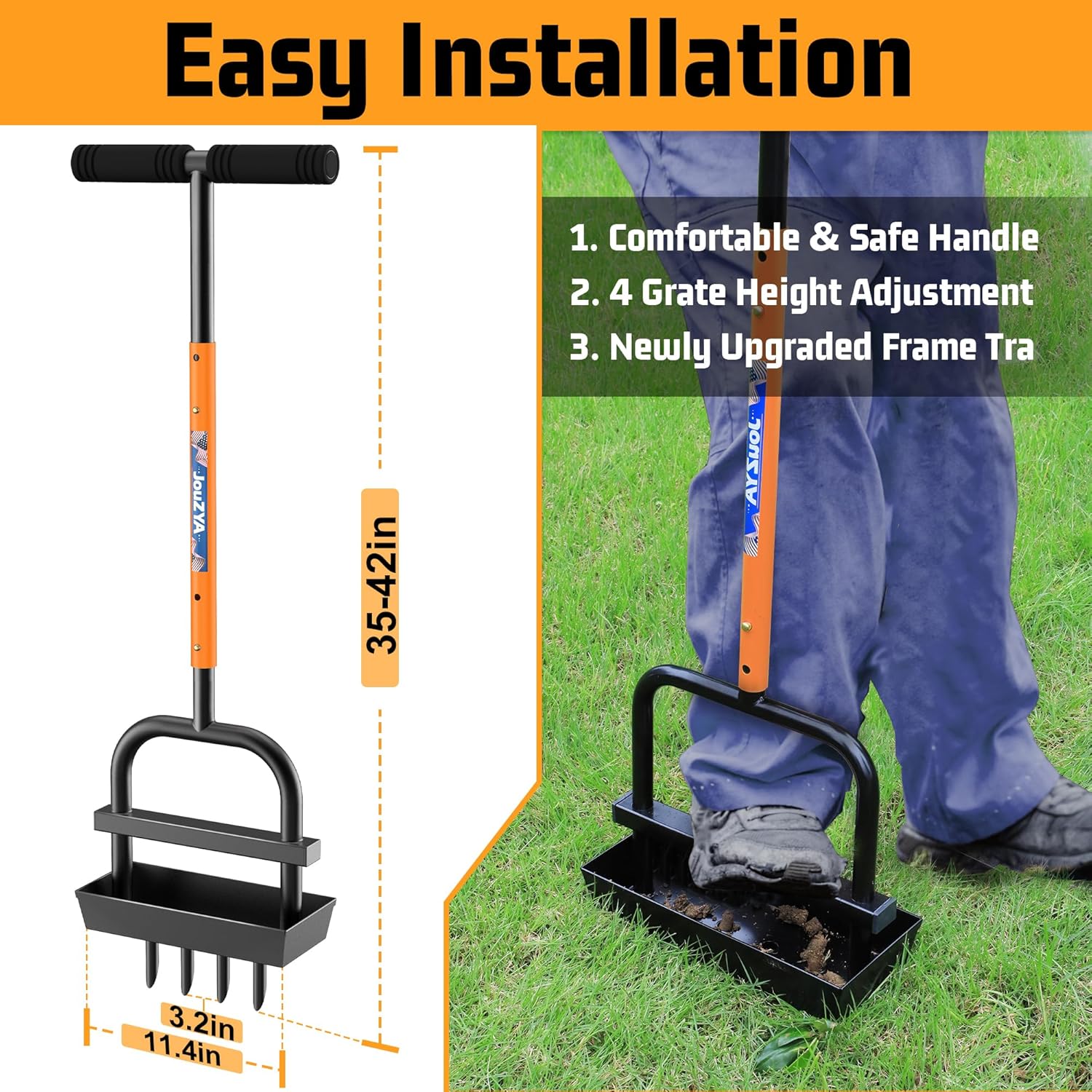 - Built-in Soil Core Tray:The upgraded JouZYA lawn aerator features a built-in soil core collection tray that automatically gathers soil plugs during aeration. It keeps your lawn tidy, reduces the need to bend over repeatedly, and makes lawn care more efficient and hassle-free