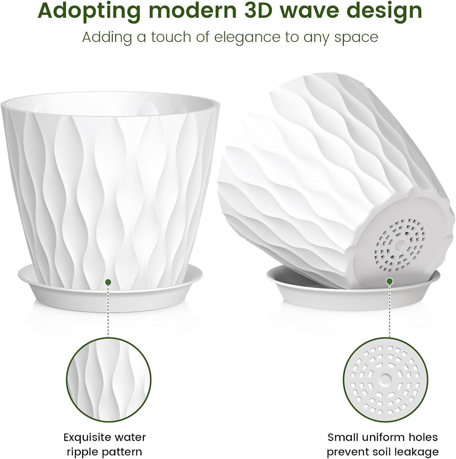 7 inch Plant Pots for Indoor Outdoor Plants, 5 Pack Thick Nursery Pots with Drainage Holes and Saucers, 3D Modern Wave Texture Plastic Planter Pots for Flowers and House Plants, White