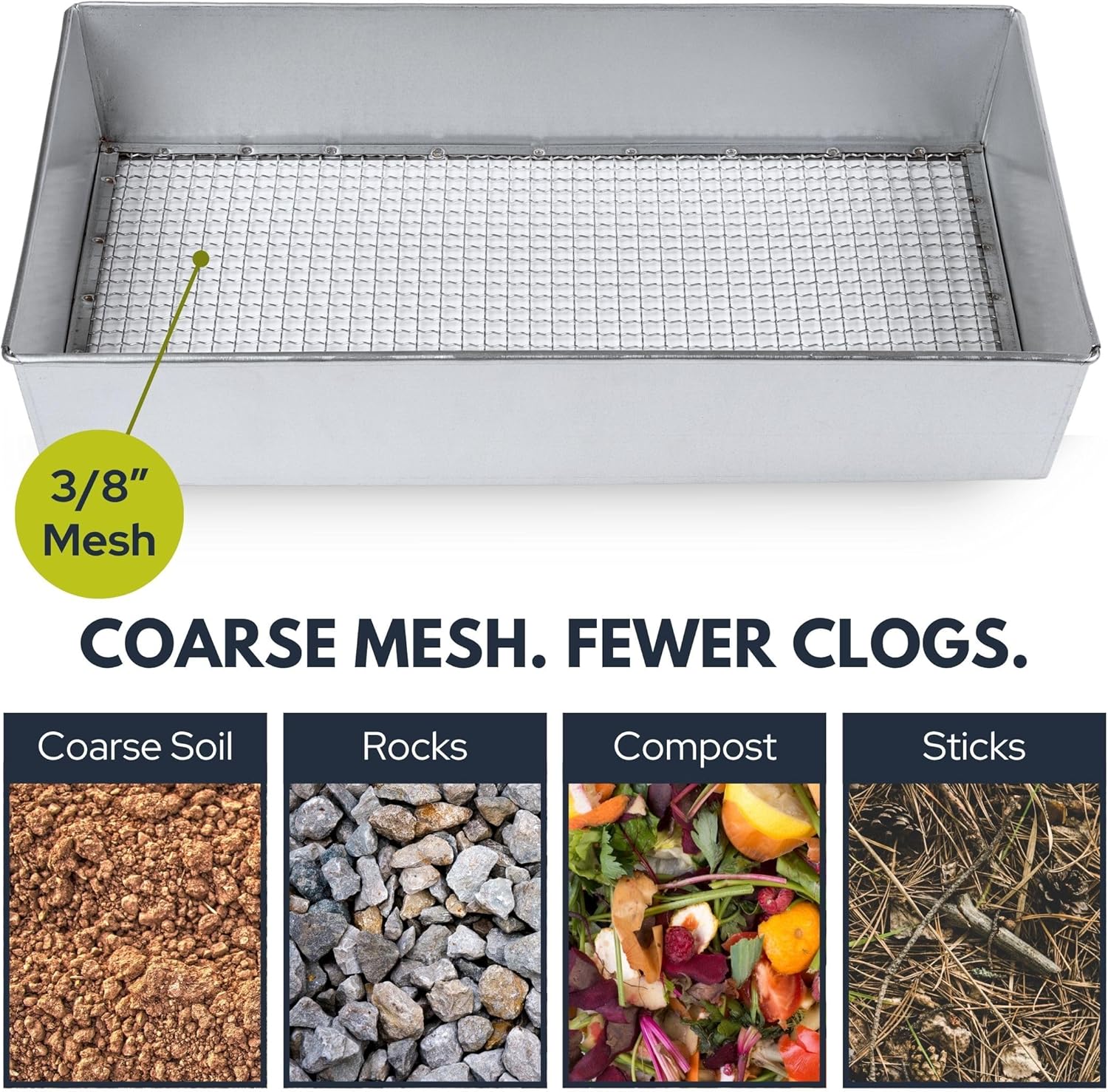 - CLEARS THE CHUNKY STUFF: 3/8" mesh lets through the good stuff, holds back the junk. Great for gravel, coarse soil, and compost with clumps and sticks