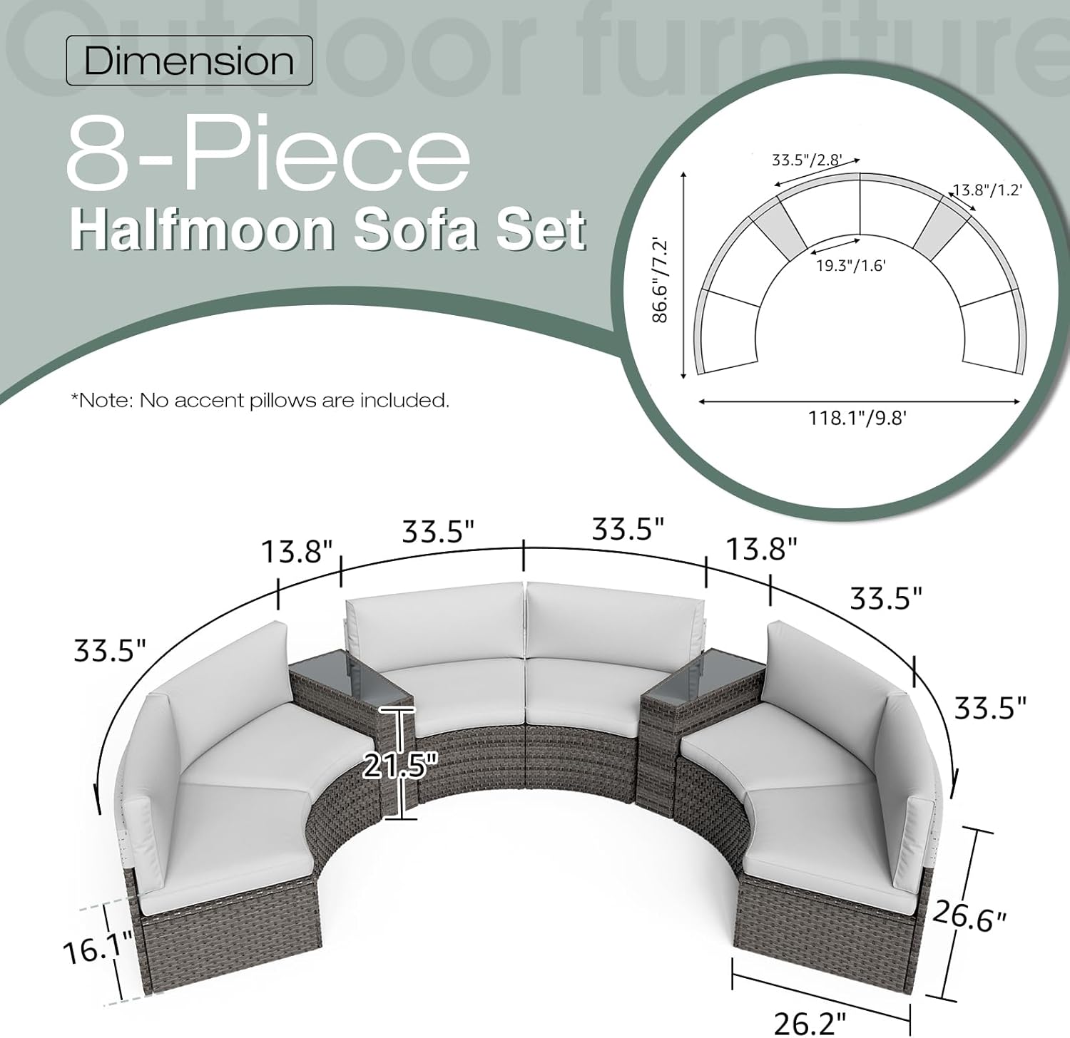 - Half Moon Design - Olefin fabric in beige with rich rattan weave creates stylish half-moon sectional set. Included 6 armless chairs that together create a unique semicircular lounge. The striped pillows add a touch of elegance and style to your patio, garden, backyard, porch, sunroom or pool.
