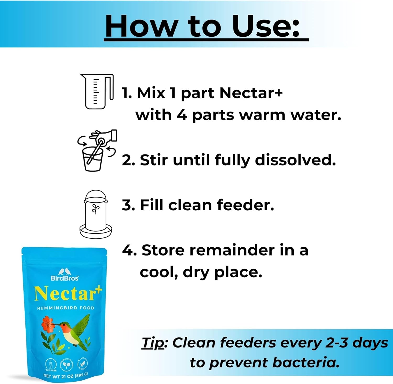 - Made in the USA – Family-Owned Brand: Produced in small batches by BirdBros, Nectar+ is proudly made in the USA. Our family-owned business is dedicated to delivering high-quality hummingbird food you can trust.
