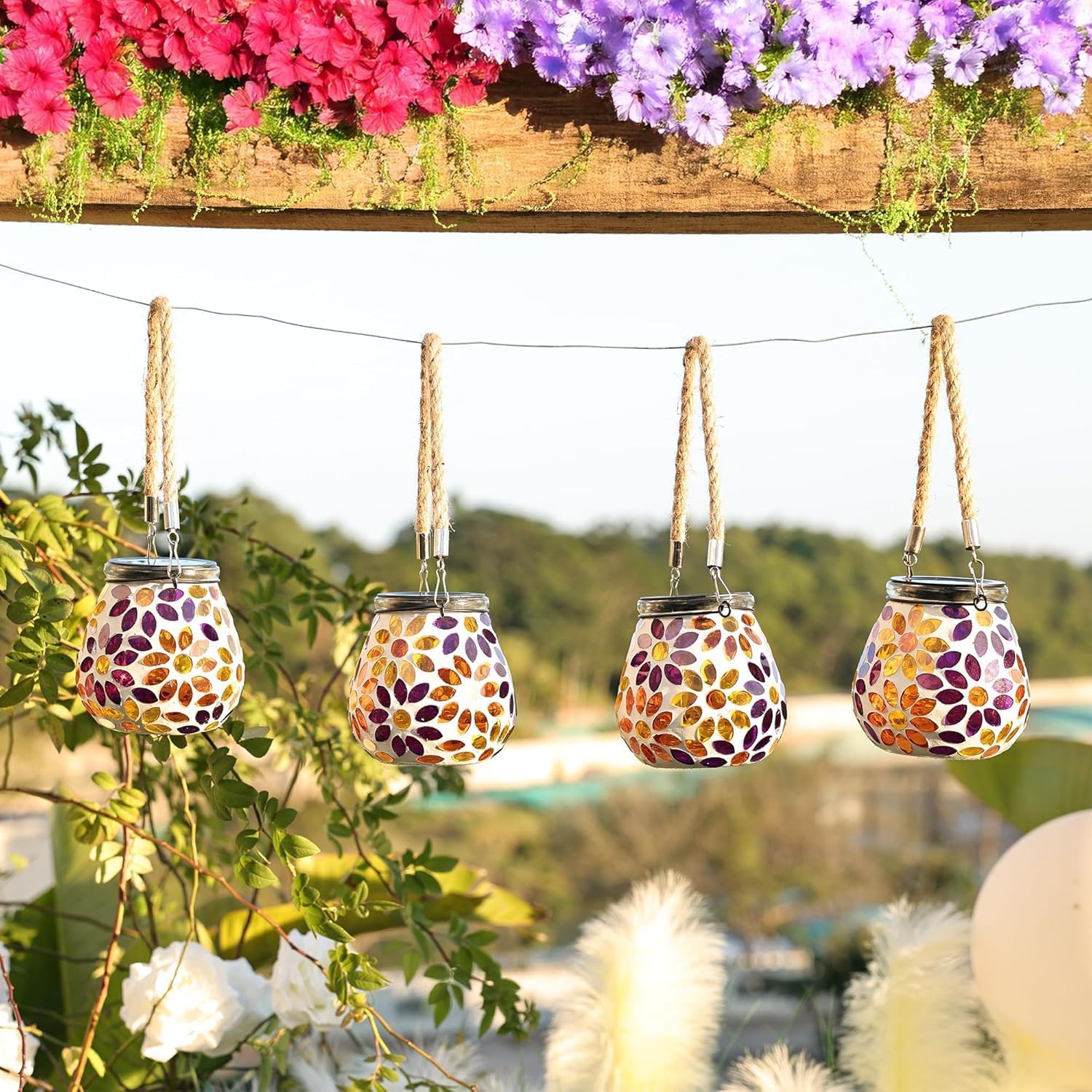 Cooo 4 Pack Mosaic Solar Lantern Outdoor Waterproof IP68 Hanging Projection Light Hidden Lid Pear-Shaped Lantern with Rope Handle Solar Powered Auto On for Patio Garden Fence Table -Petal Mirage