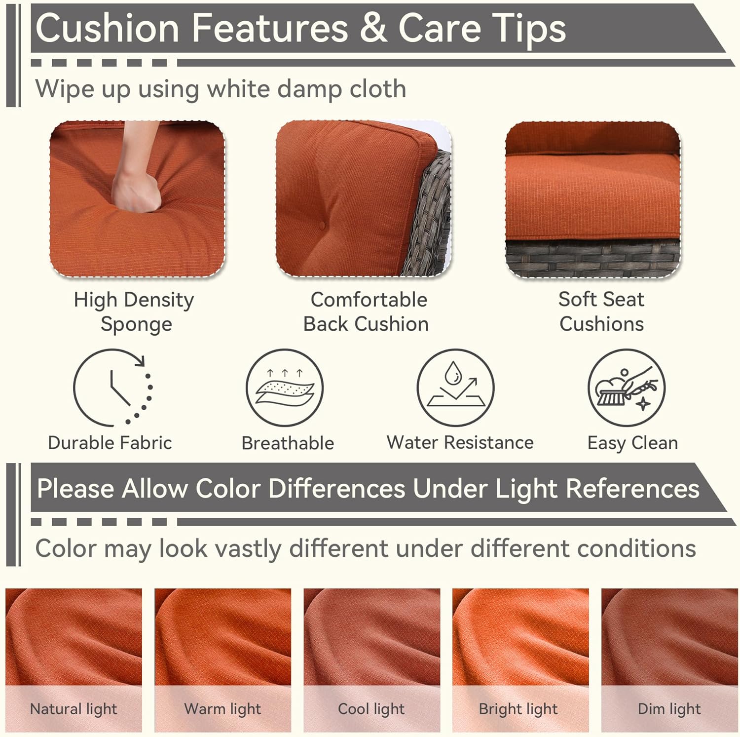 - [Easy-Clean Cushions] Wipe with a white damp cloth for easy clean. Allow for color differences in different ambient light and displays
