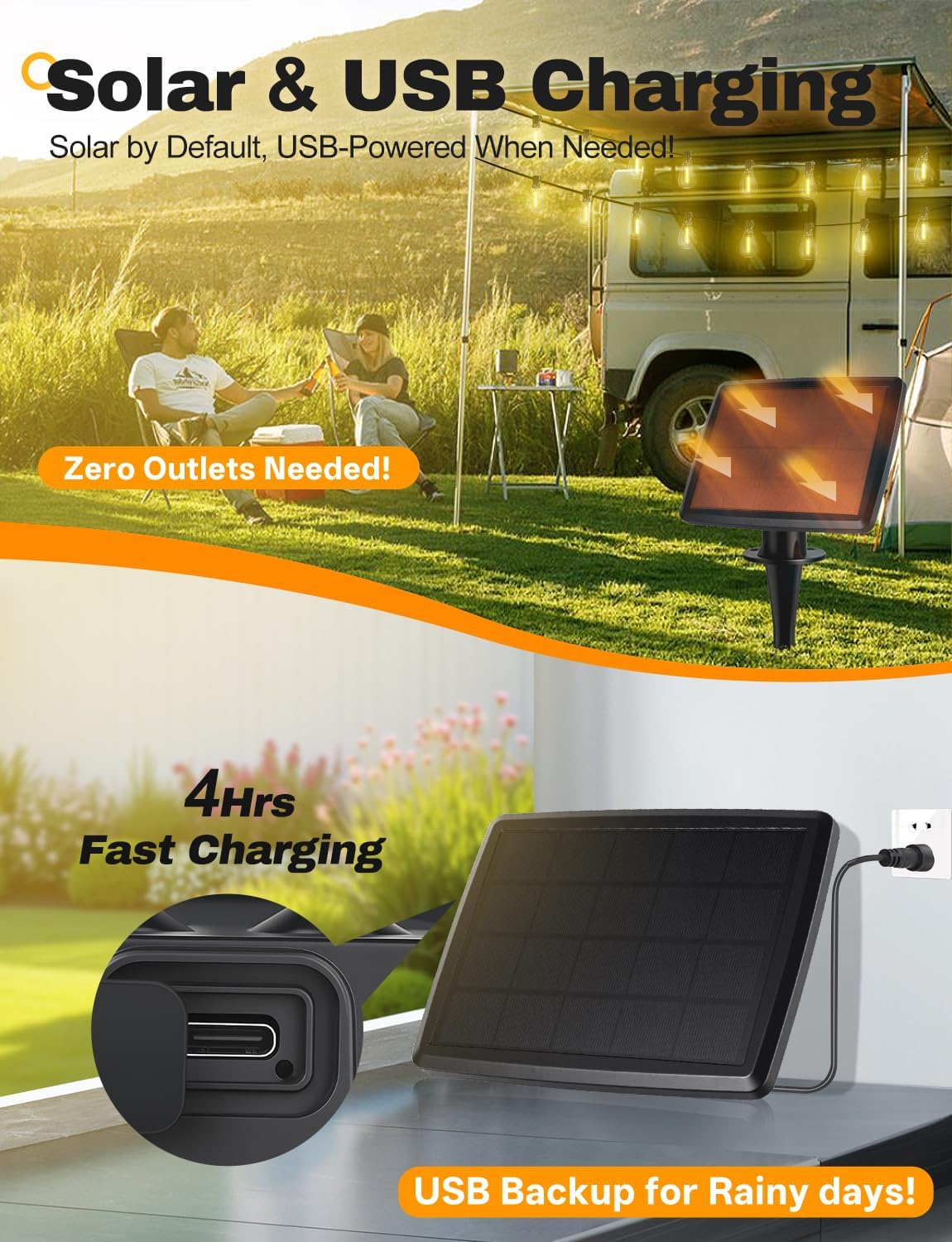 - Solar + USB Dual Charging:quipped with a high-efficiency solar panel that energy efficiency increased by 20%,it can be fully charged in just 6H on sunny day.What about consecutive cloudy or rainy days? Usb 4H fast charging is super convenient.Both Both methods keep your backyard or balcony lit for over 10H every night! No need to lay wires,don't worry about cloudy days and power outages,eco-friendly and hassle-free,Your outdoor space stays lit 365 days a year.