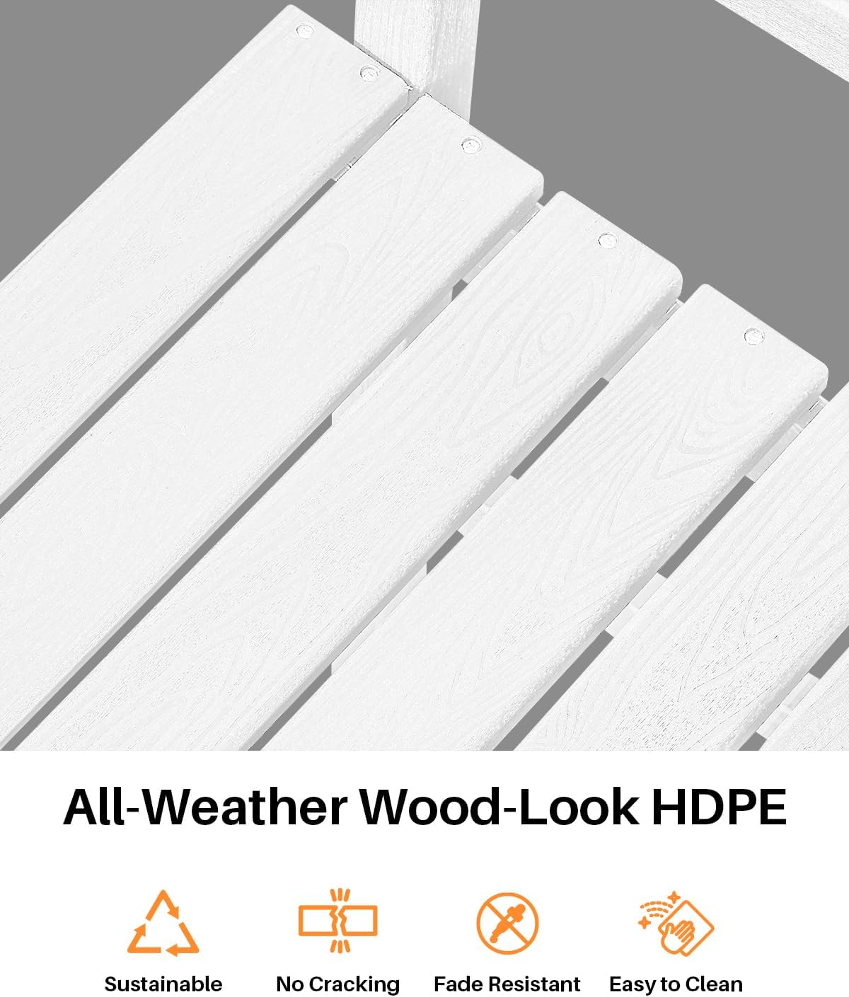 - Weatherproof and Wood-Inspired: Constructed from premium HDPE lumber in a pearl-toned faux wood grain, this pair of bar chairs stands strong through seasons of sunlight, rain, and salt air. The slatted seat design drains moisture quickly, while the soft white tone keeps your setup bright and airy.