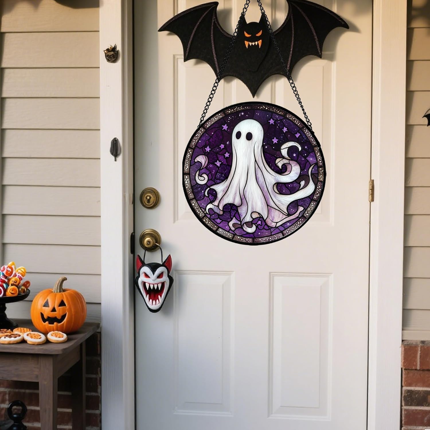 Stained Glass Window Hanging - Halloween Decorations White Ghost Purple Stars Suncatcher for Doors Garden Spooky Funny Sun Catchers Gothic Decor Horror Gifts for Women Men Friend 9.8 in