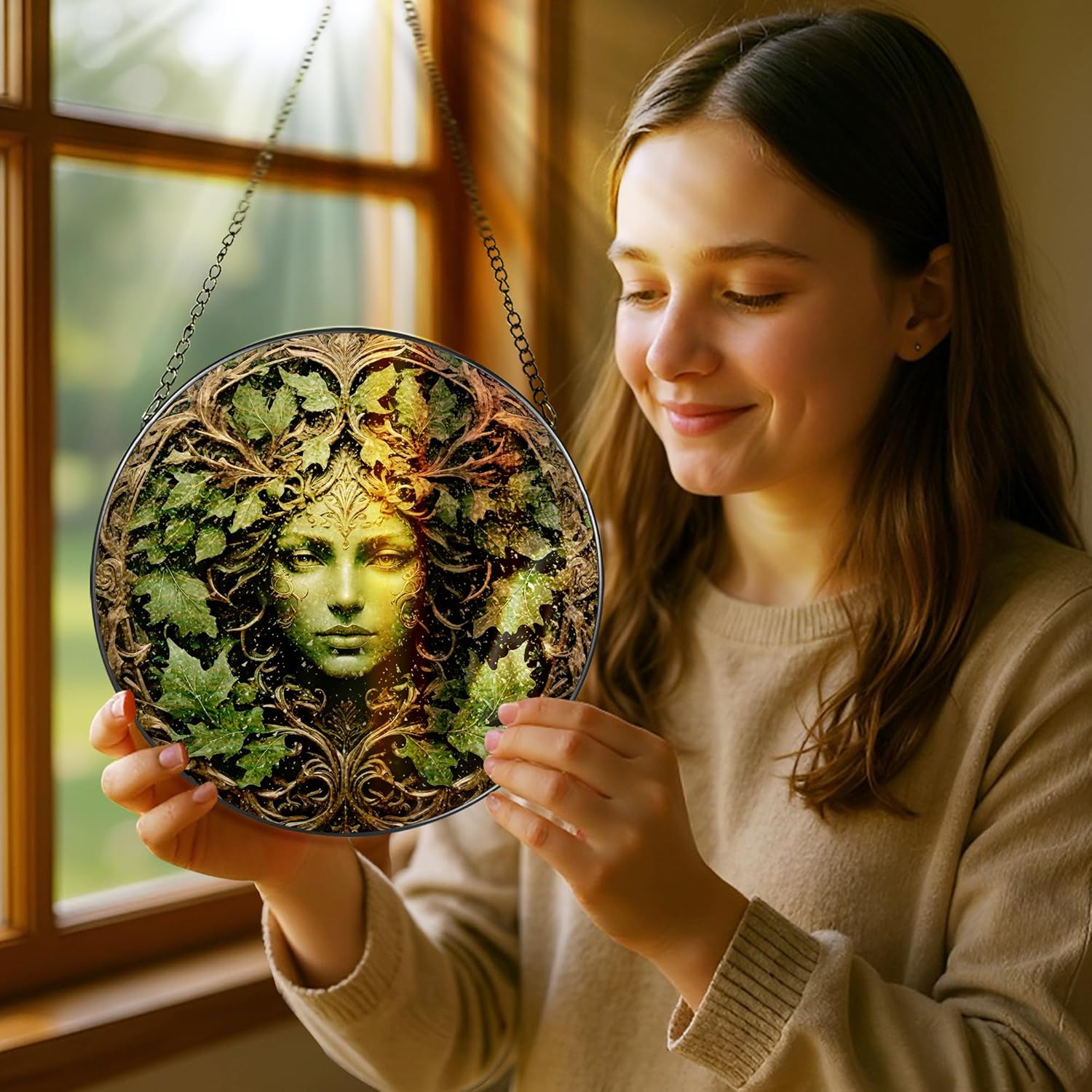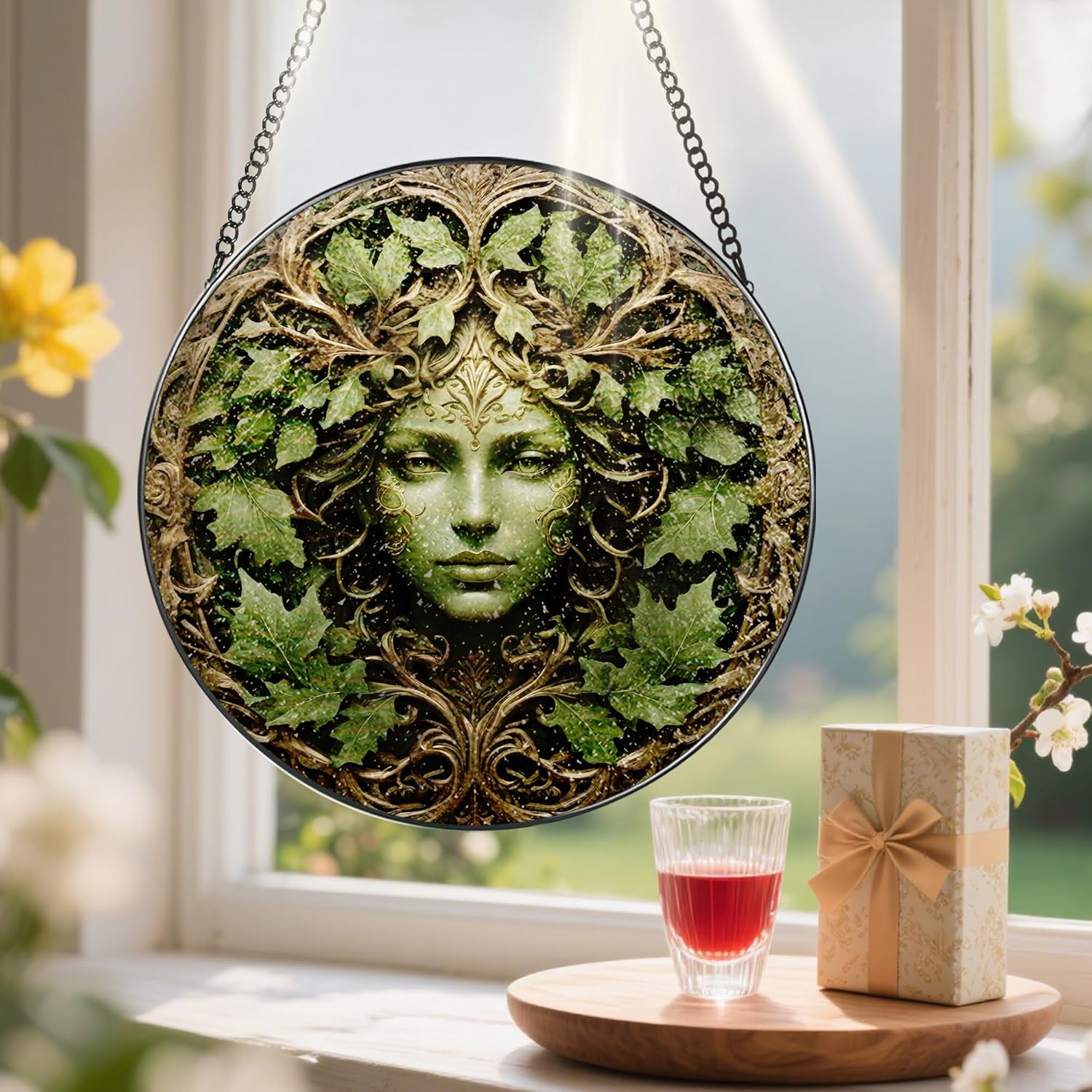 Green Man Stained Glass Suncatcher, Stained Glass Window Hanging, 8 Inch Window Decor Hanging, Gift for Garden Lovers, Mothers Day Birthday Gifts for Mom Grandma Women Sister Wife Lady Lover