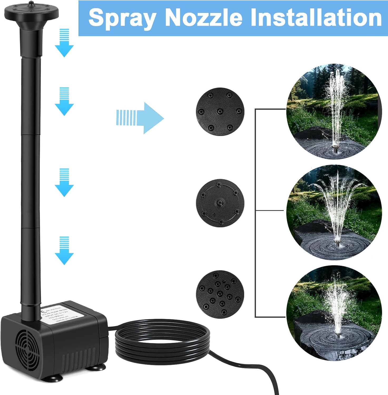 - Three water spray nozzles and a water tubing: each solar fountain set is equipped with 3 different nozzles, differnet nozzle different spray style,you can choose the most suitable nozzle, 5FT water tubing can be used to build garden water features or waterfalls