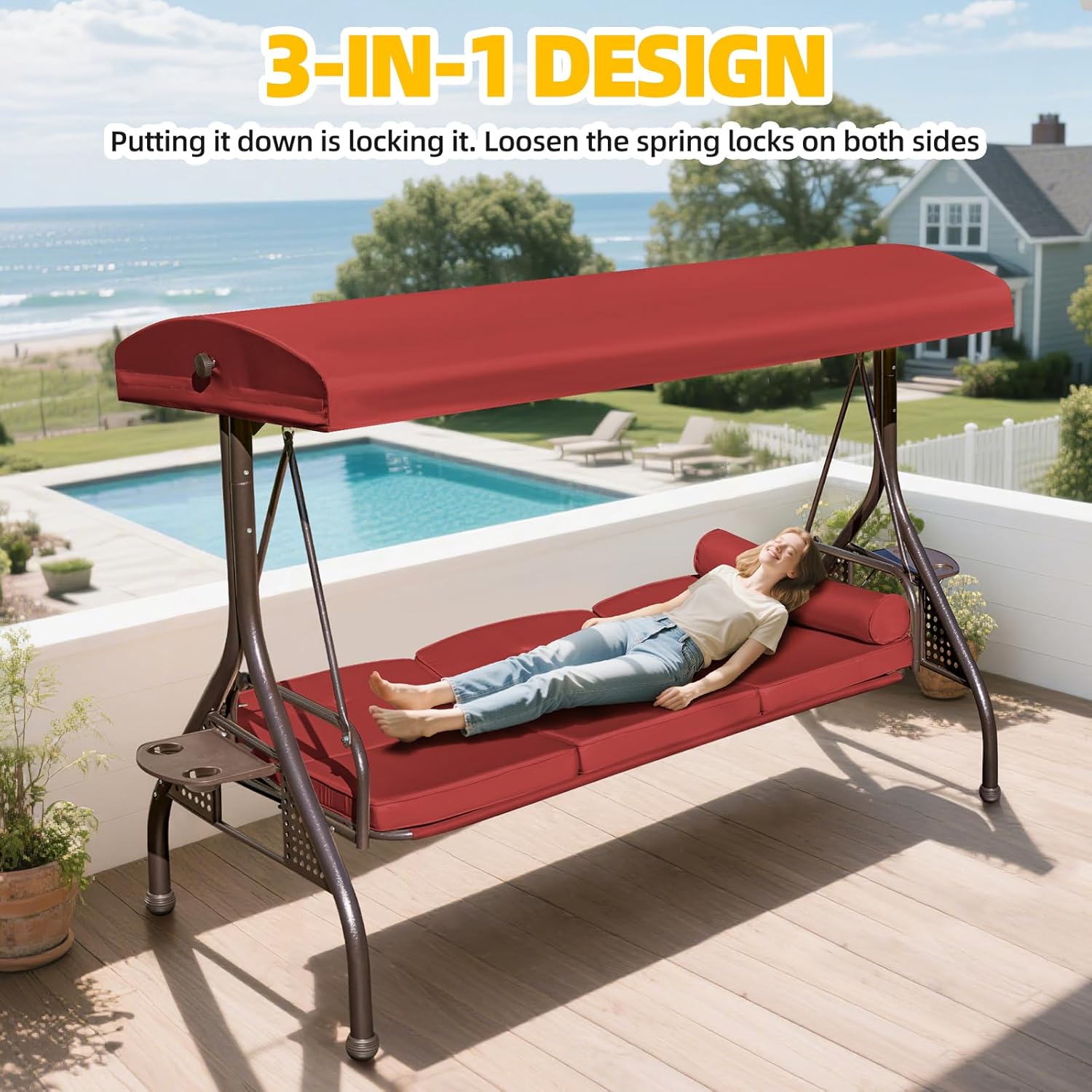 - 3-in-1 Convertible Patio Outdoor Swing Bed: Relax your way! This patio swing for adults easily transforms from a spacious 3-seat outdoor swing into a flat porch swing bed. Once reclined, the backrest locks securely in place, ensuring stability without unwanted swaying. Perfect for resting, napping, or soaking in the sun on your patio, garden, or backyard