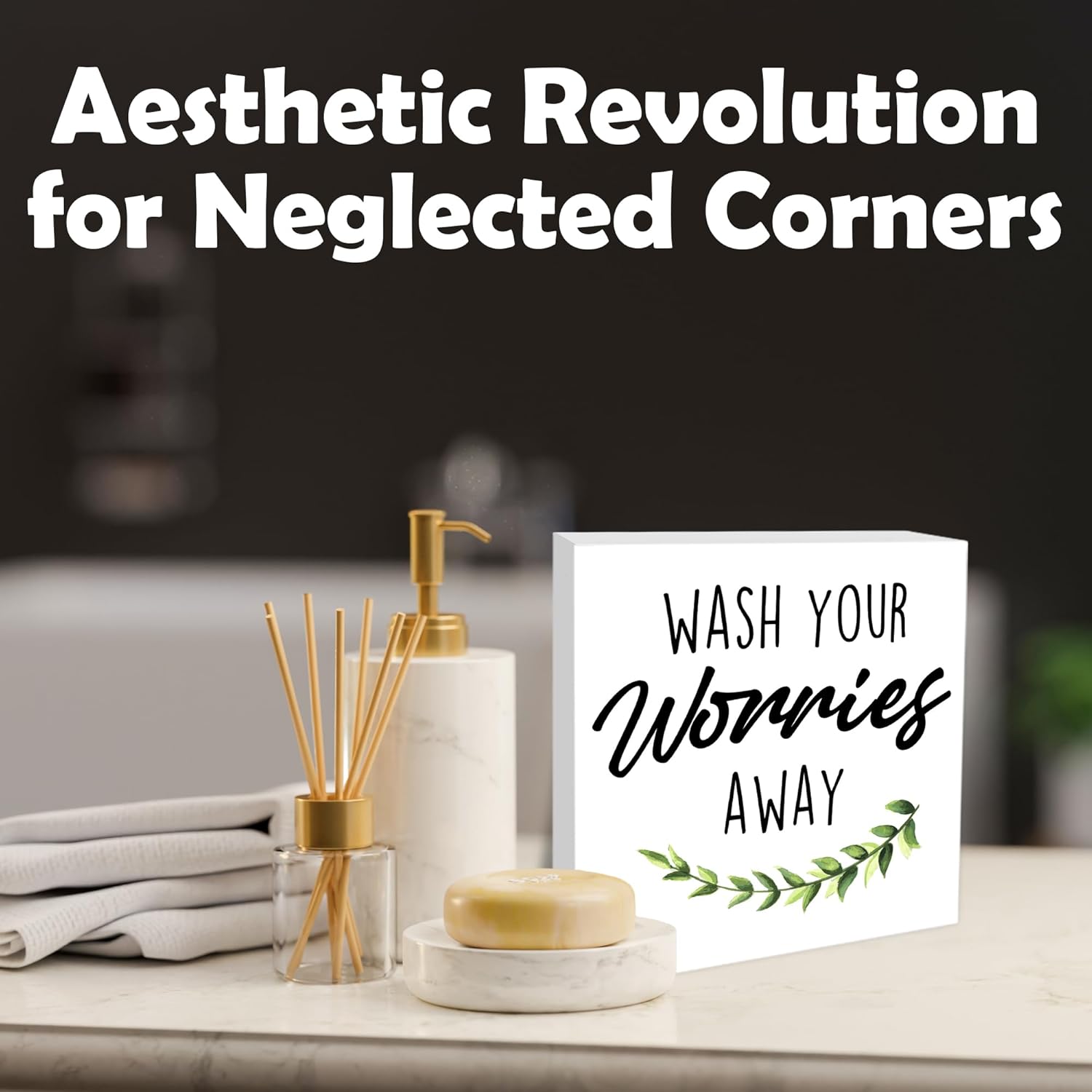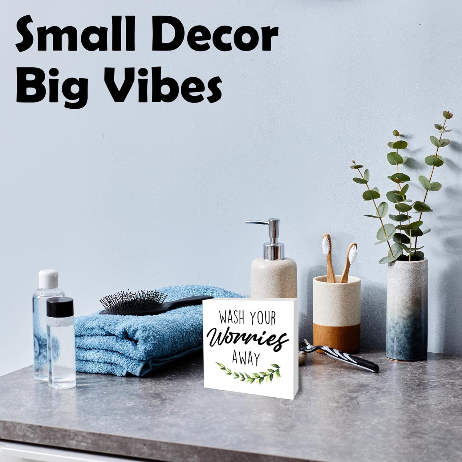 Wash Your Worries Away Wooden Block Sign - 5" Leaves Wooden Plaque Tabletop Decor - Rustic Farmhouse Wood Sign Gifts For Friends Family Coworker- Bathroom Toilets Desk Decor & Supplies -B17