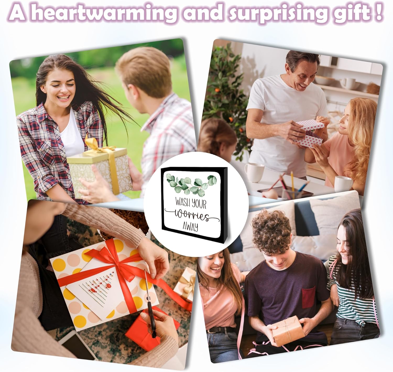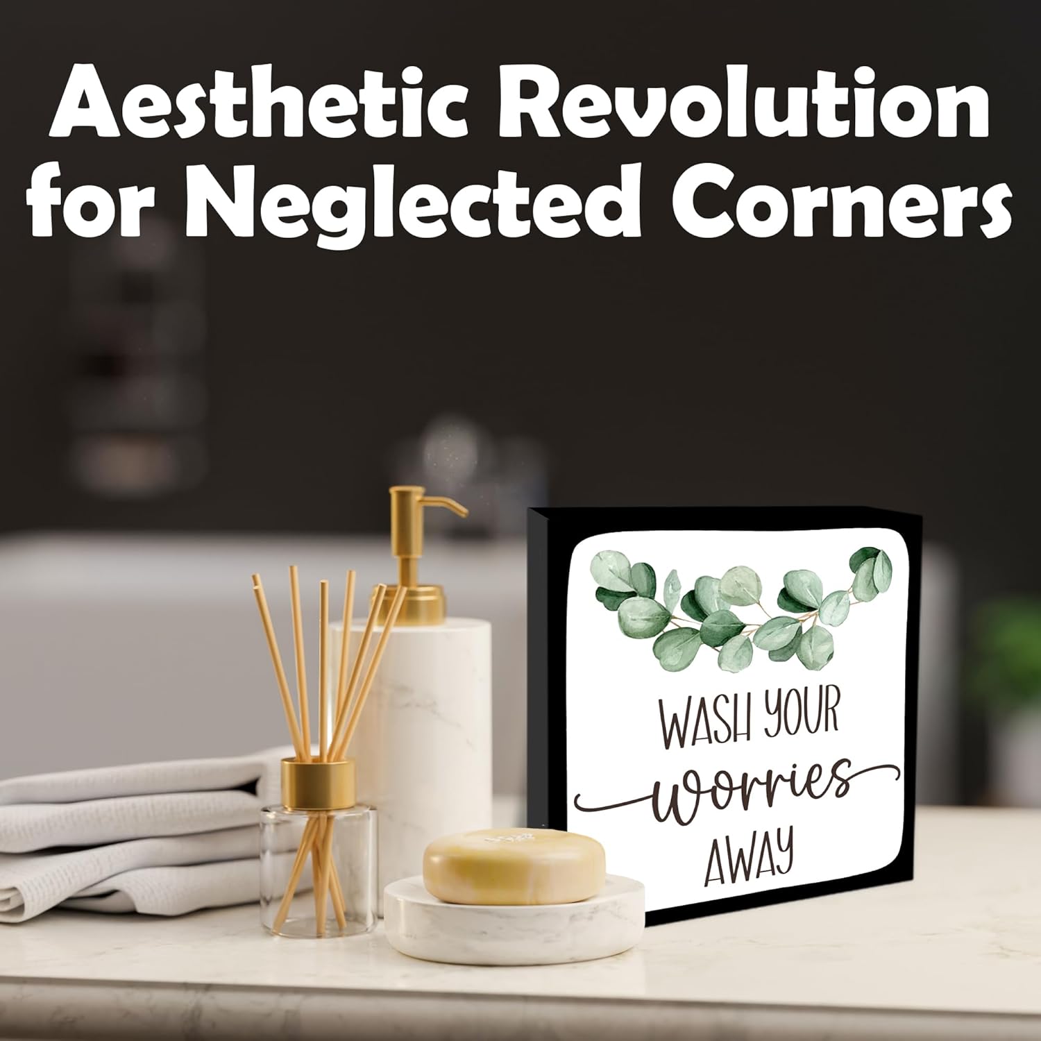 Wash Your Worries Away Wooden Block Sign - 5" Eucalyptus Leaves Wooden Plaque Tabletop Decor - Rustic Farmhouse Wood Sign Gifts For Friends Family Coworker- Bathroom Toilets Desk Decor & Supplies -B16