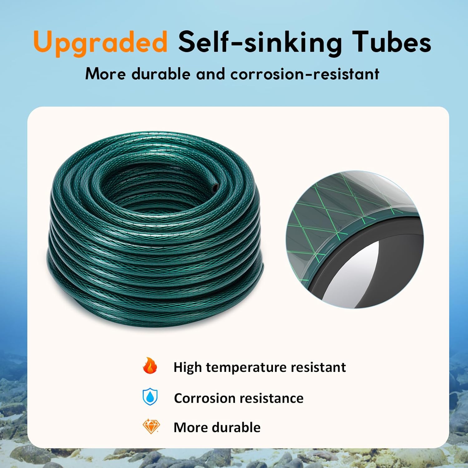 - Reinforced Submersion Tubing: Heavy-duty self-sinking tubing paired with stainless steel braided hoses withstands high pressure and temperature fluctuations, ensuring reliable operation year-round. (Installation guide included).