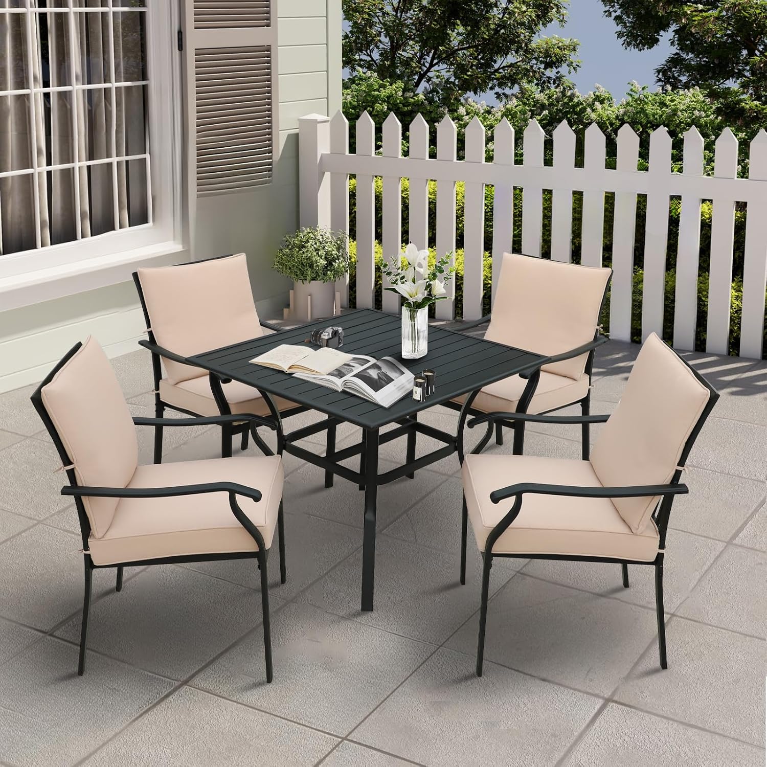 - 5-Piece Patio Dining Set: Our patio furniture set includes 4 chairs and 1 square outdoor dining table. This outdoor dining set is finished in a black powder coated surface and features soft vertical curves that match the modern clean aesthetic. The khaki cushions add a splash of colour to the set for understated sophistication.