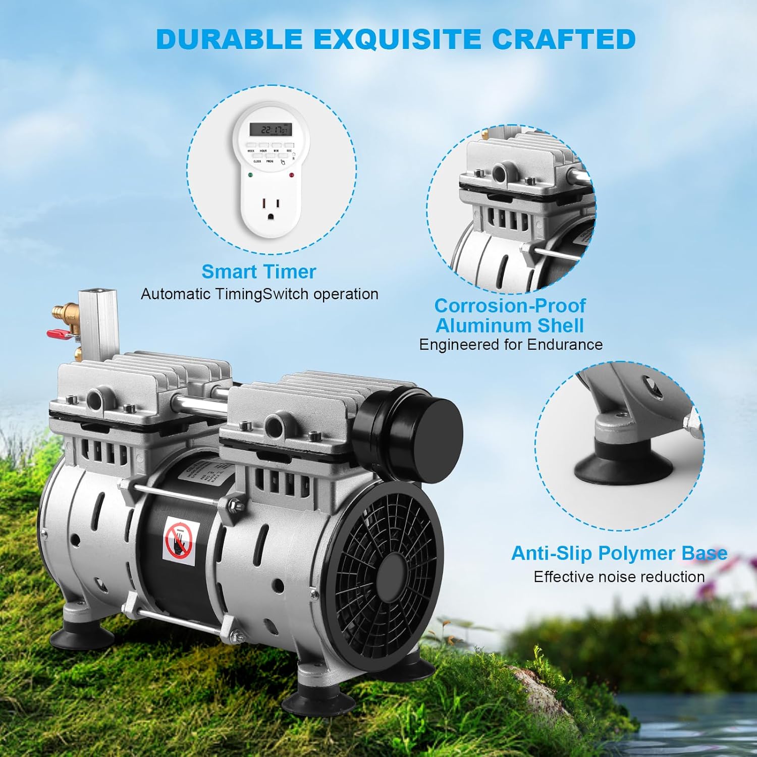 - Complete & Secure Aerator Kit: Everything included for reliable pond aeration: Air compressor, 100 ft hose, 2 high-density diffusers, timer, and all hardware. Weighted diffuser chassis ensures secure underwater positioning year after year