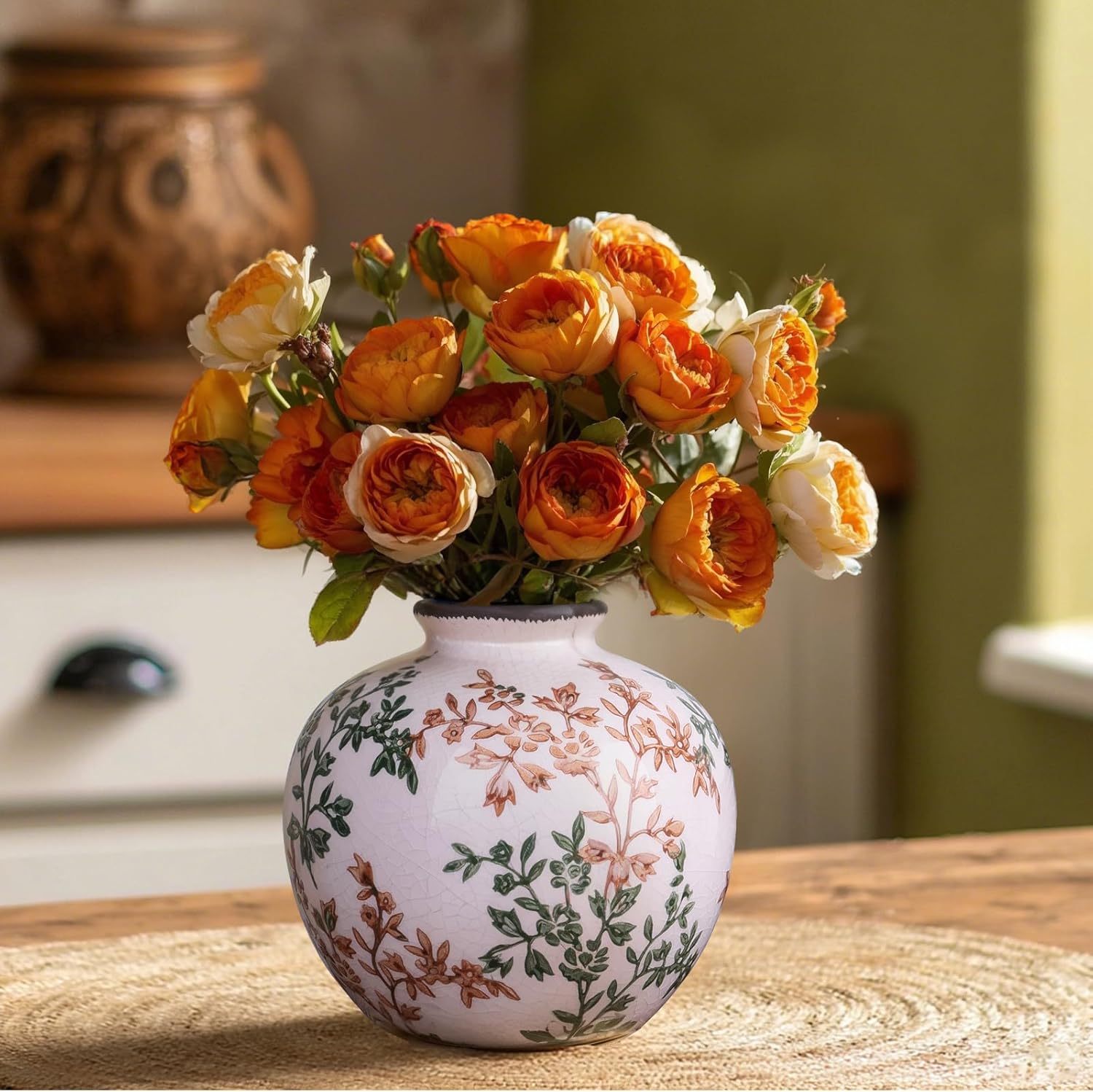Green, White, and Brown Vintage Round vase, Chinese-Style Green Farmhouse Decorative vase, Suitable for Home Decor,Living Room, Dining Table, Office, Bookshelf, TV Cabinet, entryway Decor.