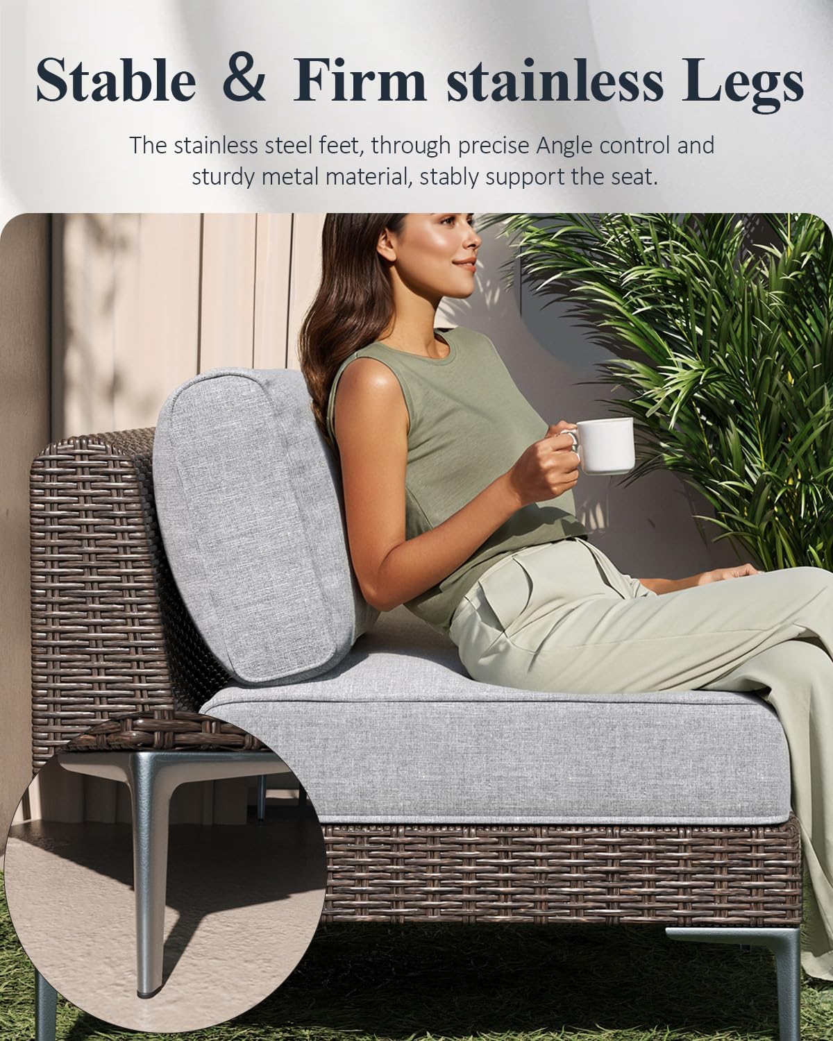 - STABLE&LIGHT BEAUTY: Patio furniture seats feature a simple stainless steel leg design. With their smooth lines and precise Angle control, they form a stable support structure, jointly creating a visually light yet rock-solid support force. While the chair U-shaped clips can effectively fix the seats and prevent unnecessary movement.
