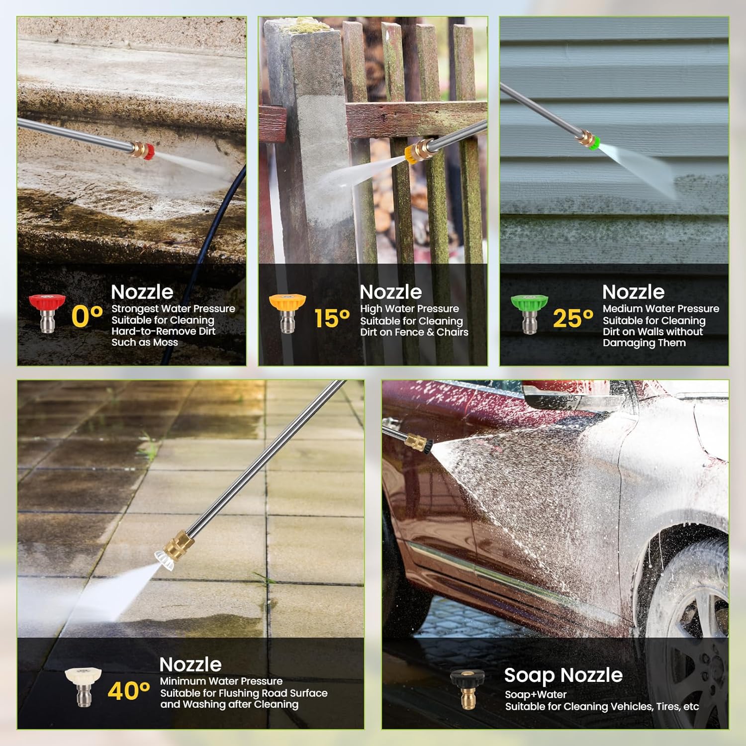 - ใ๐๐๐ฑ๐ข๐ฆ๐ฎ๐ฆ ๐๐๐๐ ๐๐๐ญ๐๐ซ ๐ ๐ฅ๐จ๐ฐ & ๐ ๐๐ฎ๐ข๐๐ค-๐๐จ๐ง๐ง๐๐๐ญ ๐๐จ๐ณ๐ณ๐ฅ๐๐ฌใ: This gas power washer can achieve the maximum water flow area when using the maximum angle nozzle (the quick-connect nozzle angle is 40ยฐ or soap); the larger the quick-connect nozzle angle used, the greater the water flow. At the same time, we are also equipped with 0ยฐ, 15ยฐ, 25ยฐ, 40ยฐ and soap nozzles for you to use.