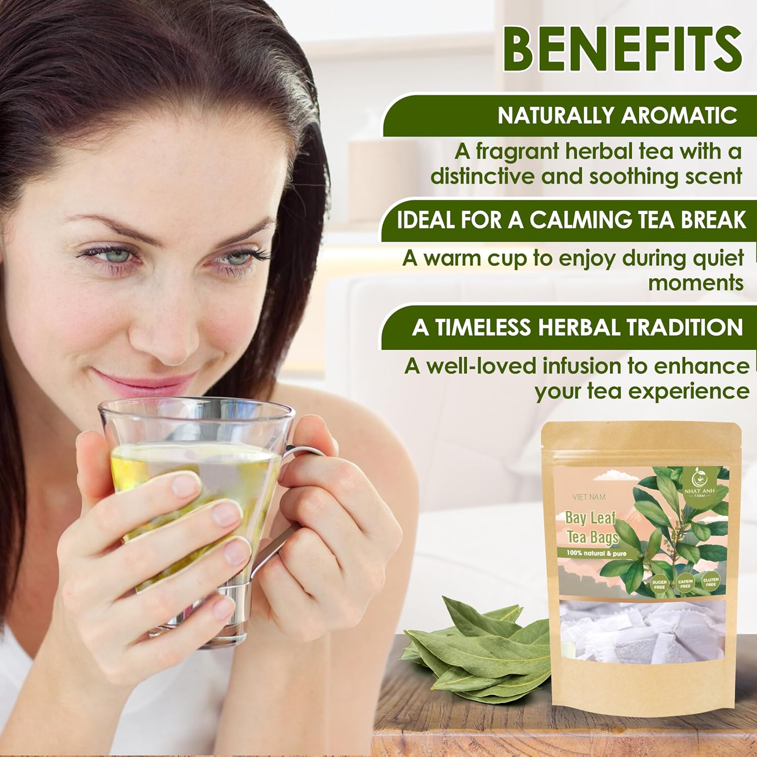 NHAT ANH FARM - Premium Bay Leaf Tea Bags, 100 Tea Bags, 100% Natural Dried Bay Leaf, Sugar-Free, Caffeine-Free, No Additives. Herbal Infusion For Daily Wellness