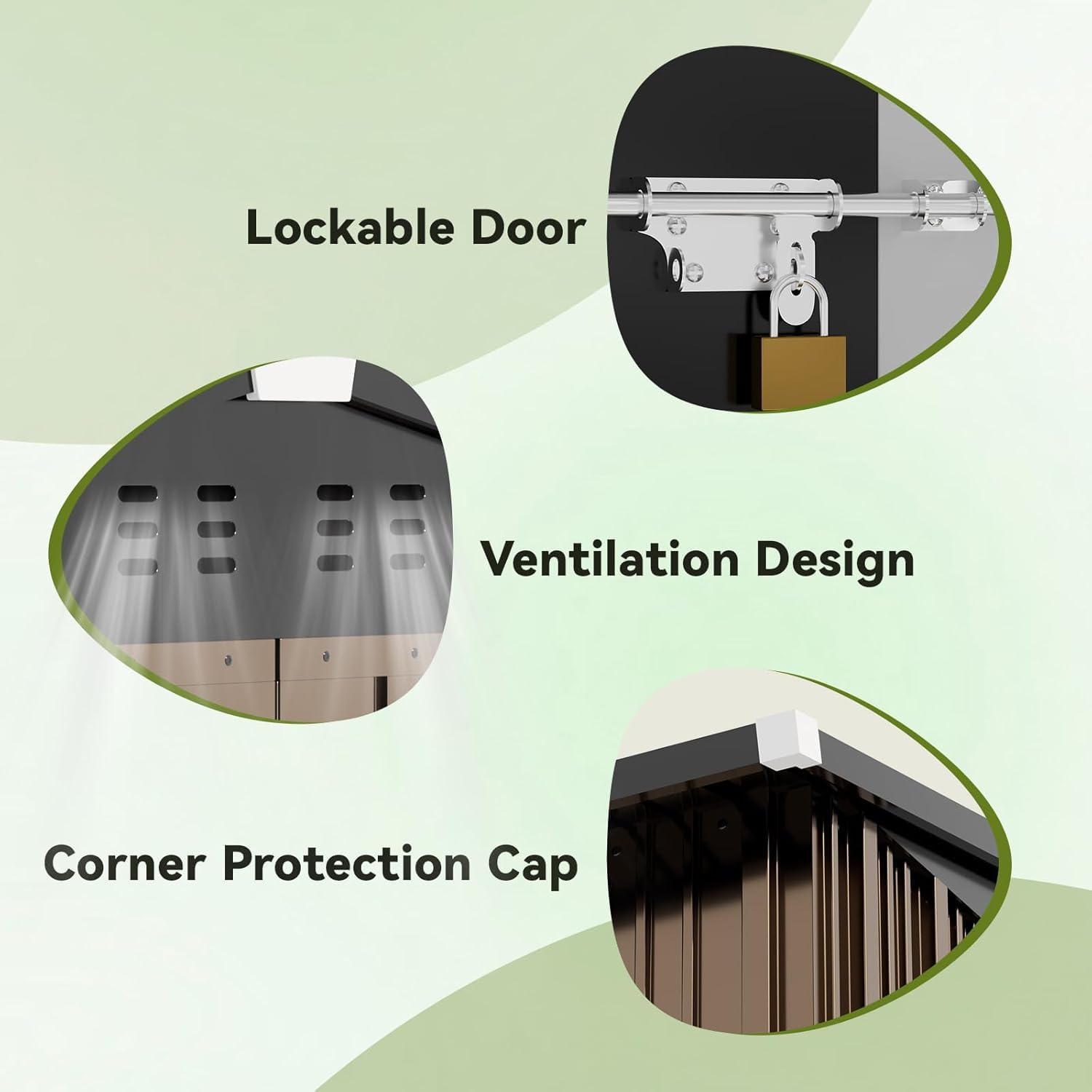 - Outdoor Shed:This storage shed is made of high-quality galvanized steel and covered with a powder-coated finish.Its durable construction ensures that it can withstand harsh weather conditions and ensure your items remain safe