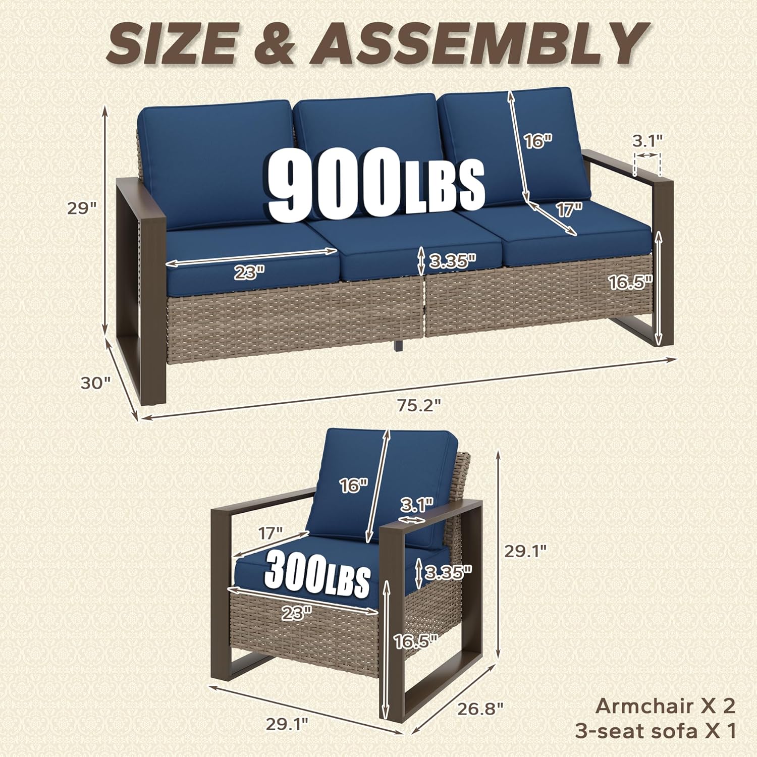 Wicker Patio 75" Sofa Set with Two Armchairs, All Weather Rattan Outdoor Conversation Furniture Set with Wood-Looking Metal Armrest & Removable Cushions for Deck Backyard Porch, Dark Blue