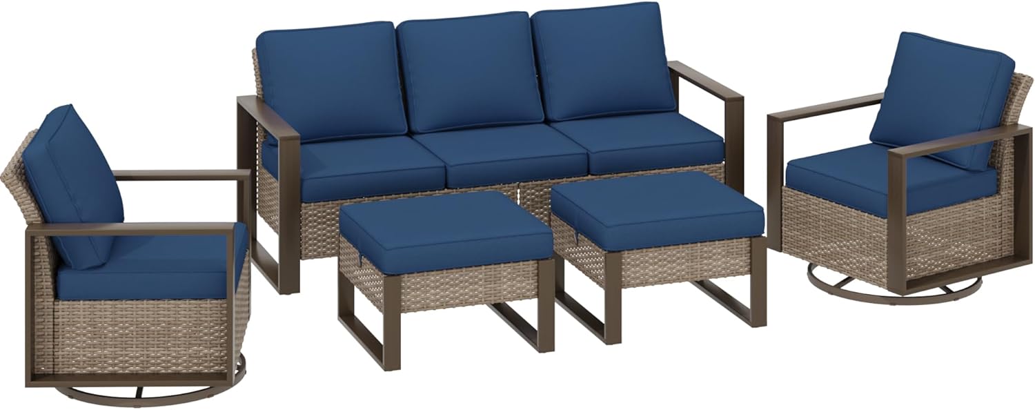 5 Pieces Metal Wicker Patio Furniture Set with 75" Sofa, Two Swivel Chairs and Two Ottomans, All Weather Rattan Outdoor Conversation Furniture with Washable Cushions for Porch, Dark Blue