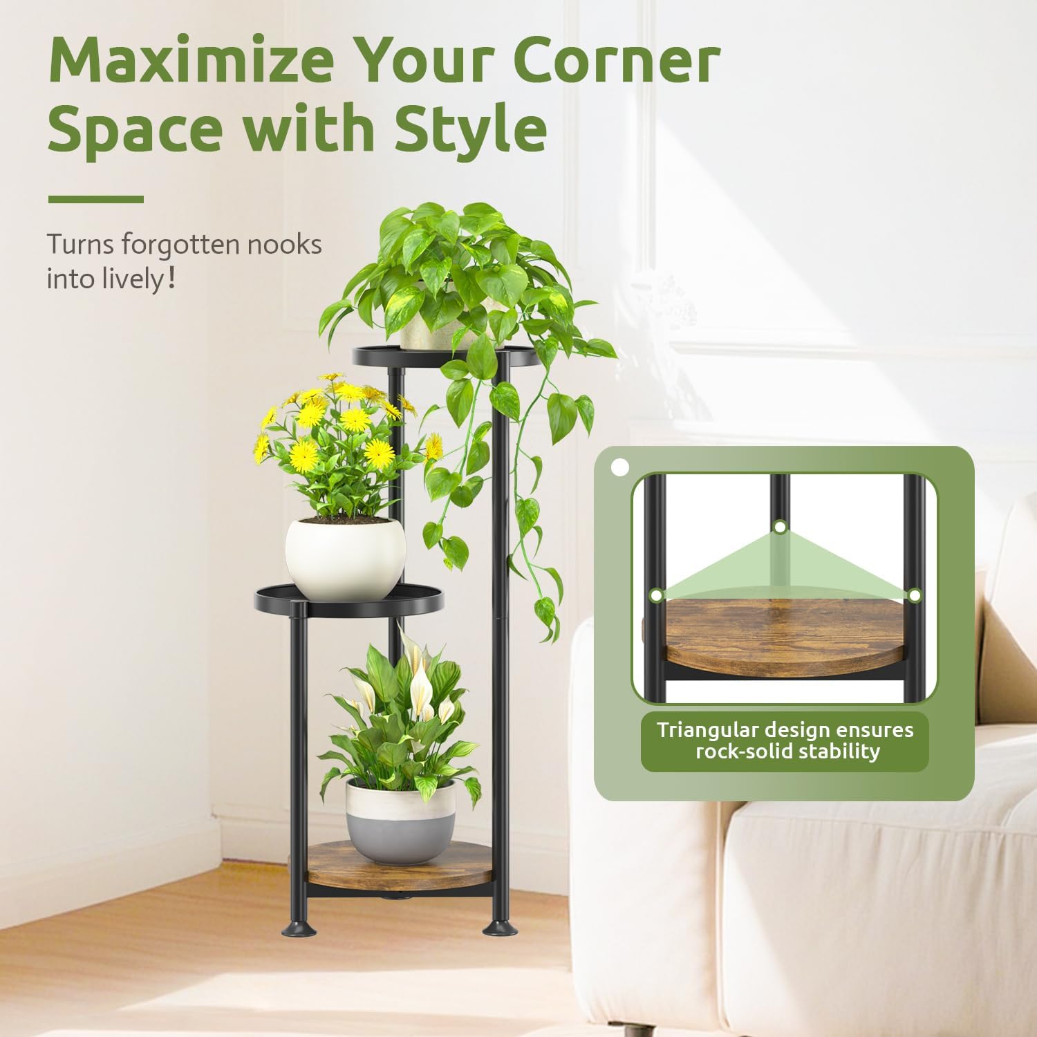 - [Built to Last, Rain or Shine] Crafted with a sturdy iron frame and a rust-proof, waterproof finish, this large plant holders is built to withstand extreme weather, indoor or outdoor. The triangular design ensures rock-solid stability, while the widened iron trays support up to 60 lbs and thickened wood boards hold an impressive 100 lbsโperfect for your heaviest plants!