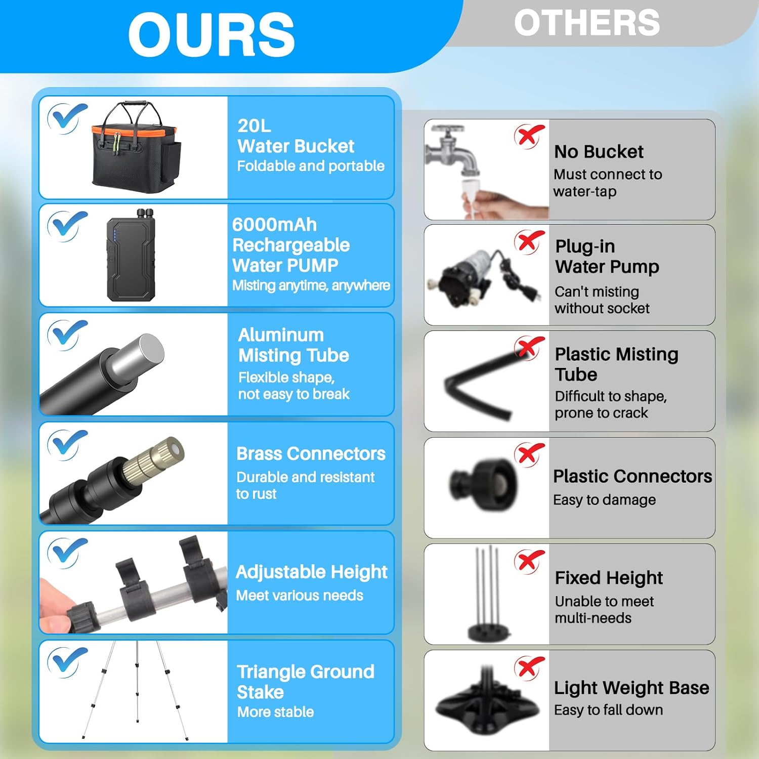 - 🔋【6000mAh PCS Pump & Perfect for Outdoor】Say goodbye to the trouble of wires! The portable misting system is equipped with a 6000mAh rechargeable water pump and it can be charged via Type-C cable, it delivers 5-8 hours of continuous misting after fully charged. A single charge provides hours of refreshing relief, let you enjoy the fun of misting anytime and anywhere at places like patio, beach, swimming pool, camping, picnics, golf cart, boat and more.
