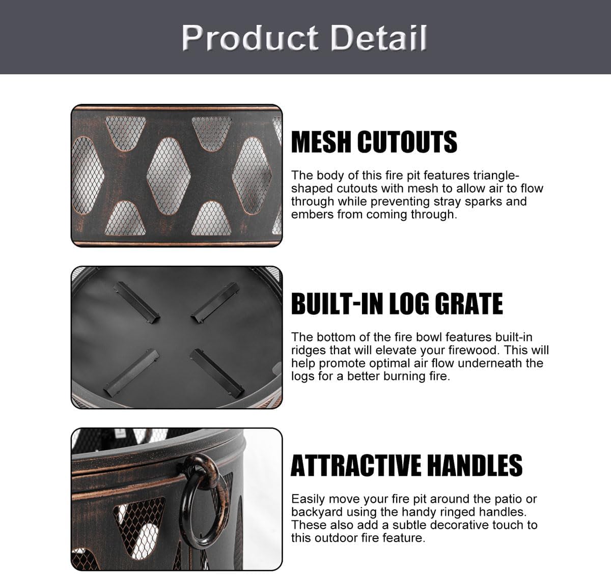 Breezz 26 Inch Wood Burning Fire Pit with Cooking Grill and Spark Screen, Outdoor Metal Round Firepit for Patio, Backyard, Bonfire Party, Camping and Garden