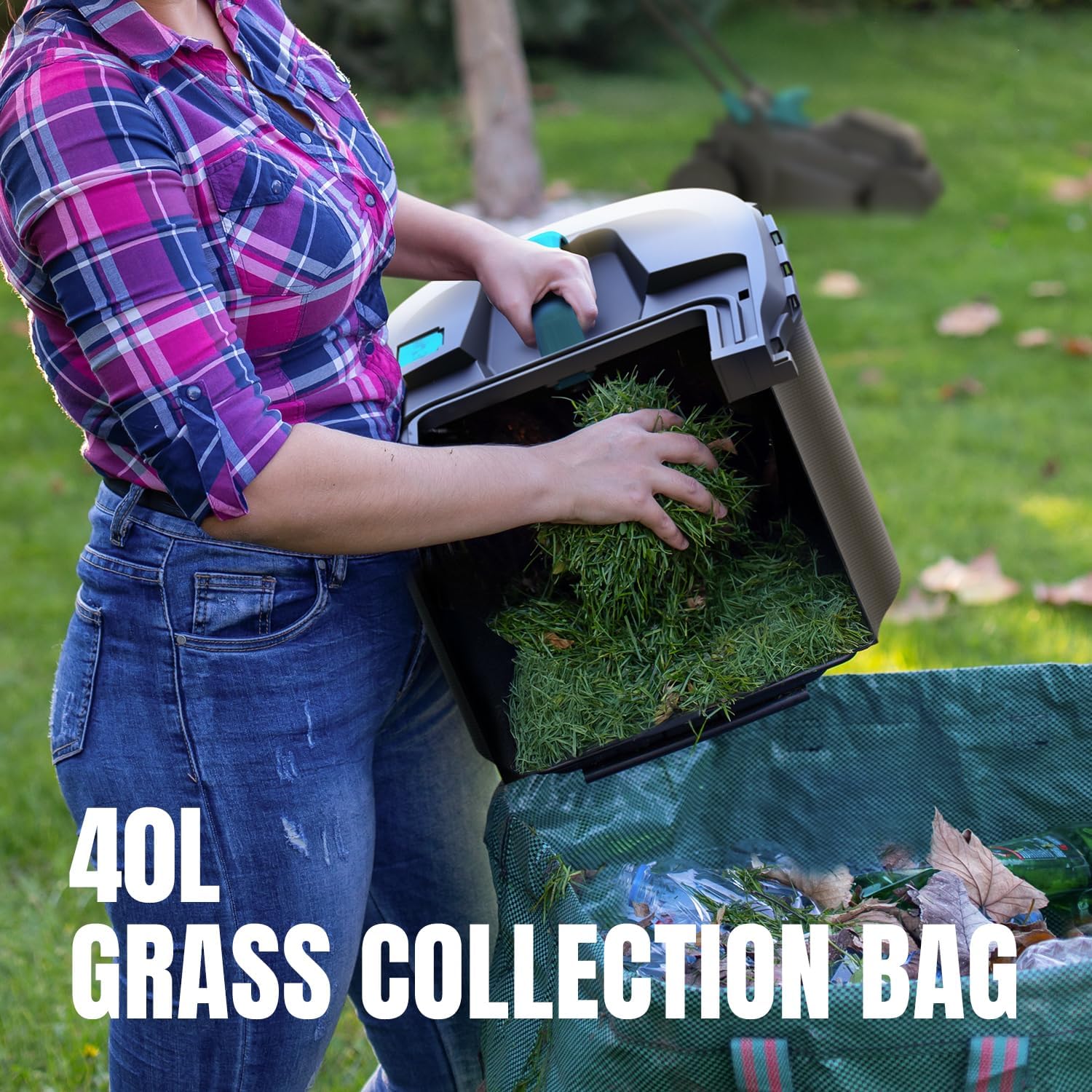 - 16 Inch Deck Width : The cordless lawn mower features a 16 inch deck width that allows you to handle grass quickly and easily, also comes with a 40L grass collection bag, perfect for gardens, yards and farms
