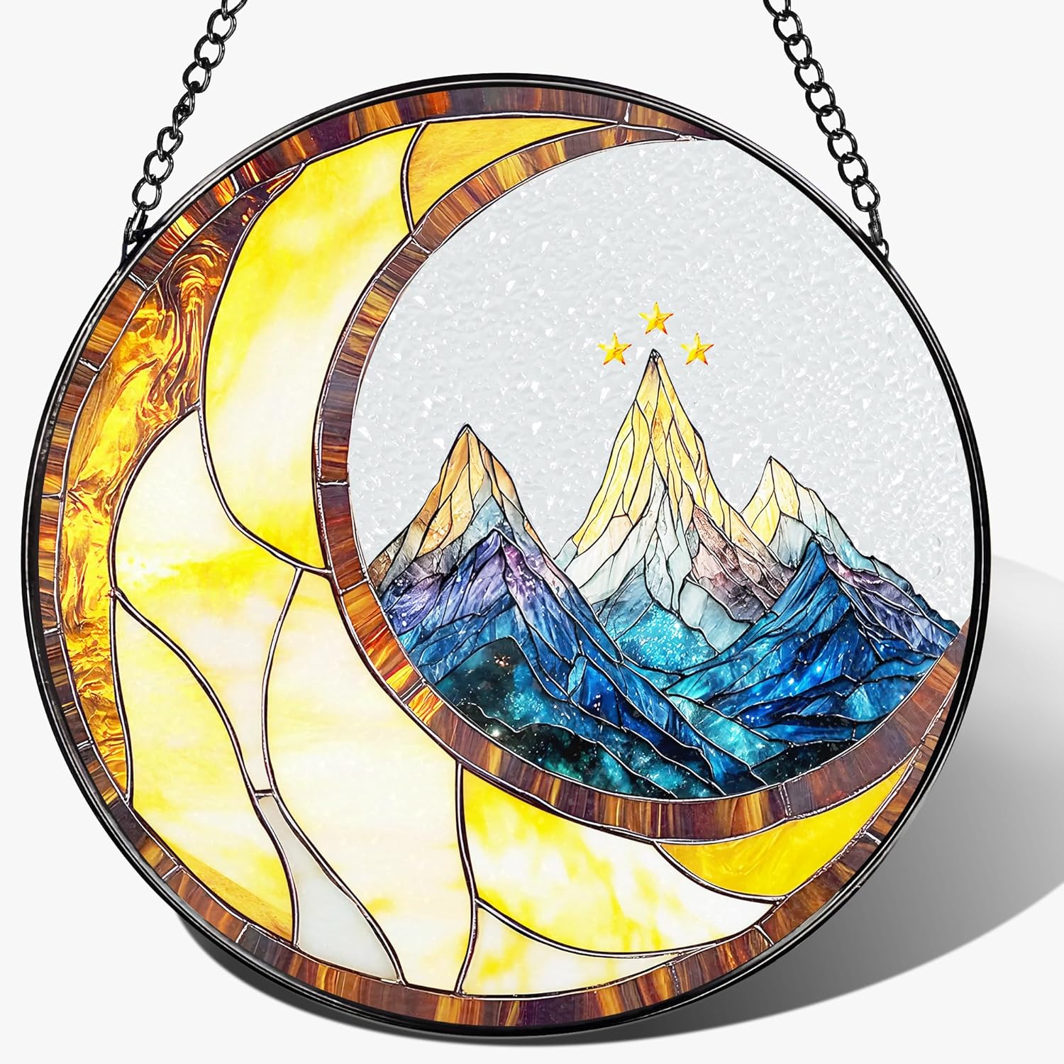 - ☀EFFORTLESS TO DISPLAY: Crafted from premium diamond glass, paired with a sleek metal frame and durable chain, this stained glass window hanging balances beauty and longevity. Hang it by windows, doors, porches, walls, or balconies; or place it on bookshelves and tabletops. Either way, it seamlessly complements its surroundings, elevating the space with instant elegance.
