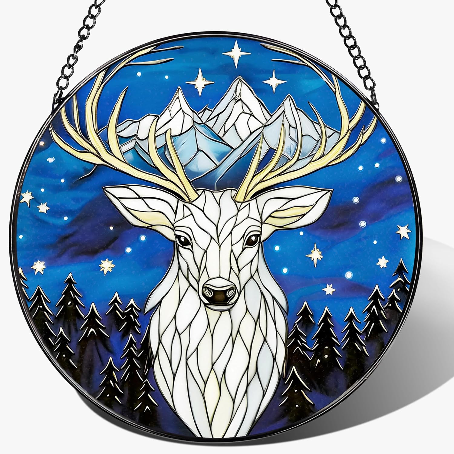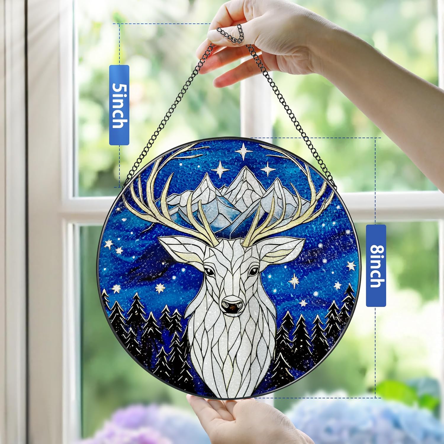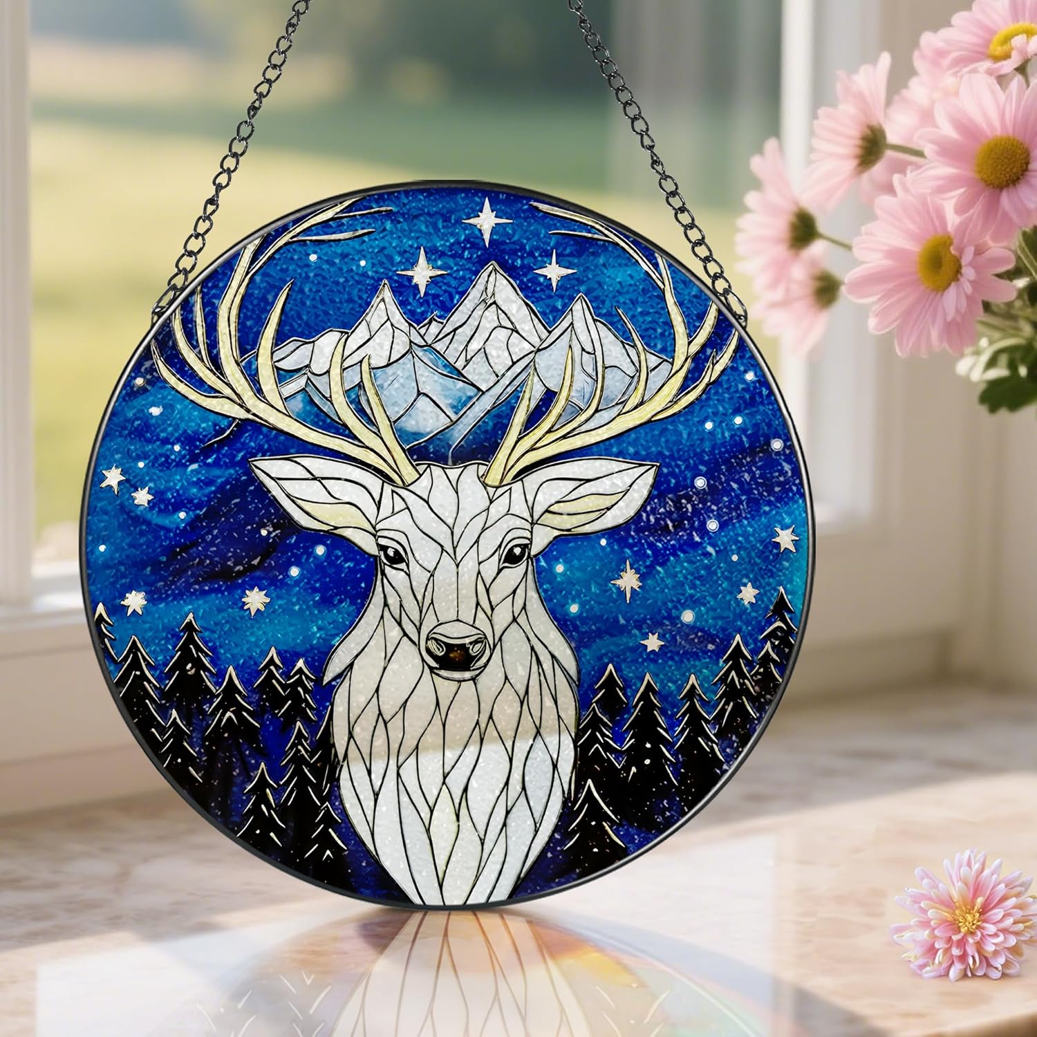 - ☀EFFORTLESS TO DISPLAY: Crafted from premium diamond glass, paired with a sleek metal frame and durable chain, this stained glass window hanging balances beauty and longevity. Hang it by windows, doors, porches, walls, or balconies; or place it on bookshelves and tabletops. Either way, it seamlessly complements its surroundings, elevating the space with instant elegance.