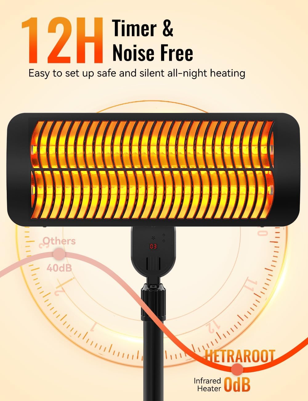 - đ„ă12H Smart Timer & Noise FreeăEasily set the heating duration with 12H timer. Before bedtime, put the electric patio heater to auto shut off after you fall asleep, ensuring safety all night and saving energy. During outdoor parties, set it to turn off after the event ends, guaranteeing safety and energy savings even if you forget to turn it off. The room heater runs silently! Only infrared heating without blowing noise, perfect for providing a quiet rest or work space.