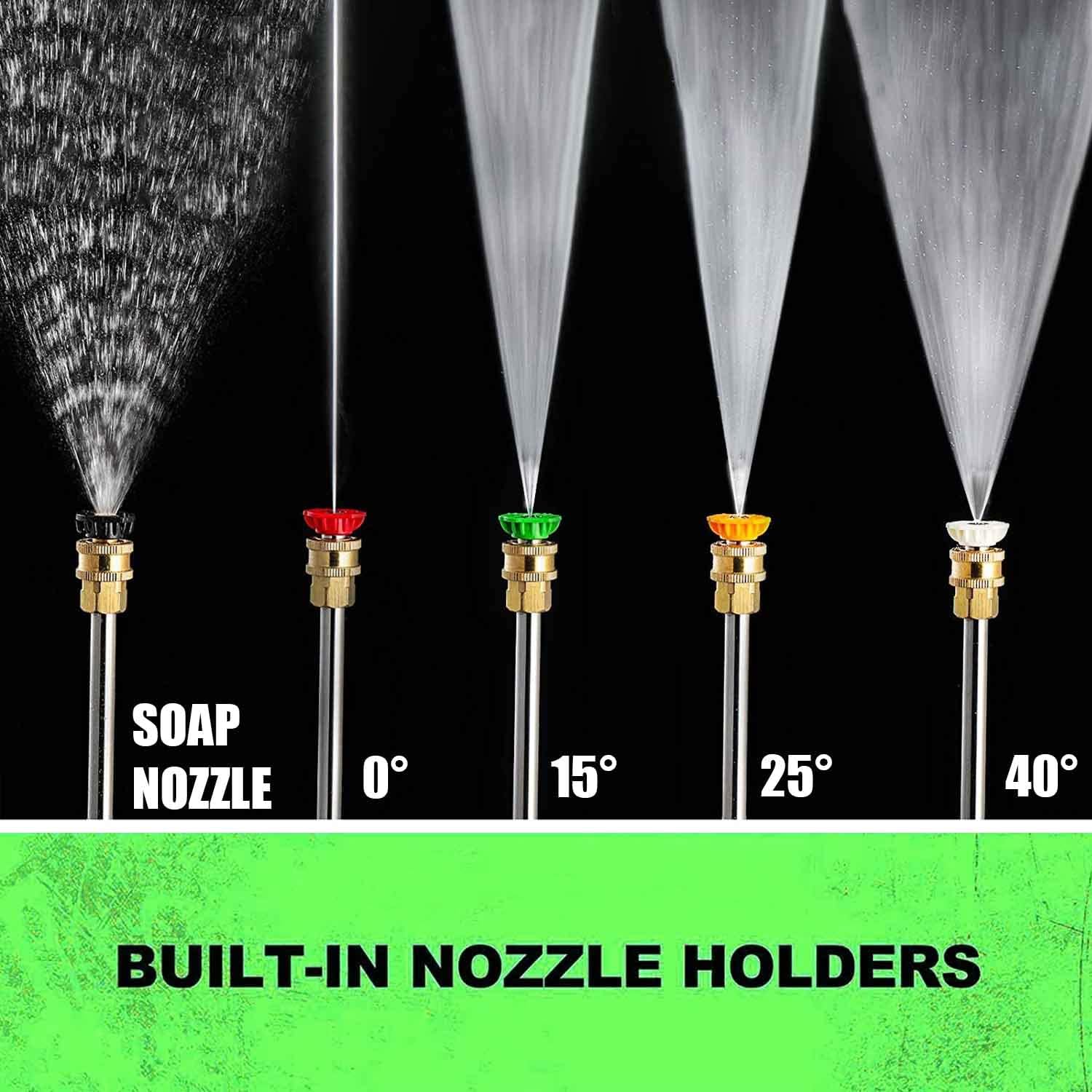 - Versatile Nozzles for Every Job, Every Surface! Choose the perfect spray angle with our specialized nozzles β designed for all surfaces! The 0Β° tip powers through the toughest messes, 15Β° for concrete, 25Β° for wood and siding, 40Β° for delicate surfaces, and a black tip to get rich, soapy bubbles for car washing. Switch up and clean with precision!